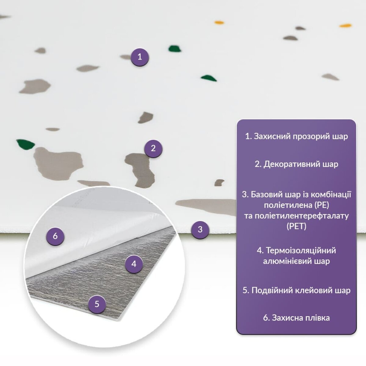 Як і в натуральних матеріалах, малюнки РЕТ плиток можуть трохи відрізнятися між собою, зберігаючи при цьому загальний дизайн та колір, що ще більше підкреслює природну імітацію. Також просимо взяти до уваги, що виробник має право змінювати зовнішній вигляд товару, зокрема відтінок та малюнок, на власний розсуд і без попереднього повідомлення.Шари матеріалу: