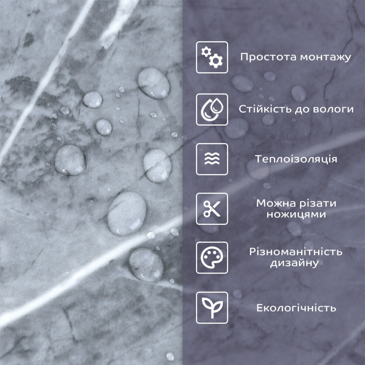 - 1. Легкість та міцність: плитка легка та міцна, що спрощує її логістику, установку та забезпечує довгий термін служби. Матеріал легкий в установці, можна різати ножицями чи монтажним ножем, не потребує додаткових матеріалів чи спеціалістів. Між смугами не розходиться, не роздмухується і не деформується. Відсоток обрізу становить 1%, що є найкращим показником для настінних покриттів;