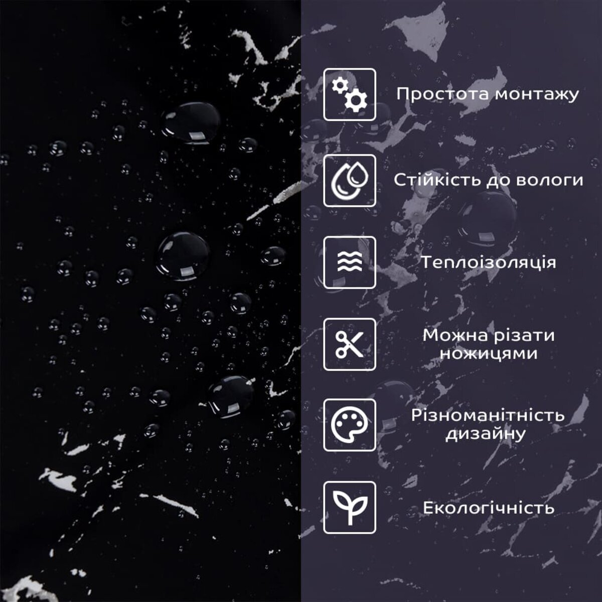 - 1. Легкість та міцність: плитка легка та міцна, що спрощує її логістику, установку та забезпечує довгий термін служби. Матеріал легкий в установці, можна різати ножицями чи монтажним ножем, не потребує додаткових матеріалів чи спеціалістів. Між смугами не розходиться, не роздмухується і не деформується. Відсоток обрізу становить 1%, що є найкращим показником для настінних покриттів;