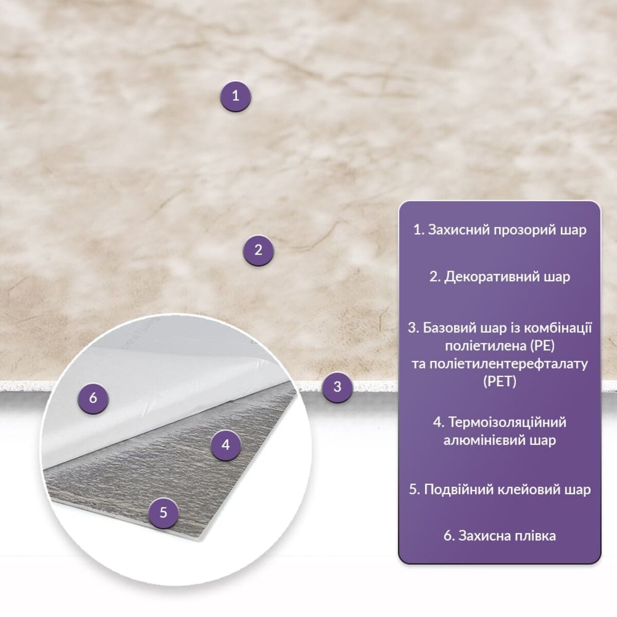 Як і в натуральних матеріалах, малюнки РЕТ плиток можуть трохи відрізнятися між собою, зберігаючи при цьому загальний дизайн та колір, що ще більше підкреслює природну імітацію. Також просимо взяти до уваги, що виробник має право змінювати зовнішній вигляд товару, зокрема відтінок та малюнок, на власний розсуд і без попереднього повідомлення.Шари матеріалу: