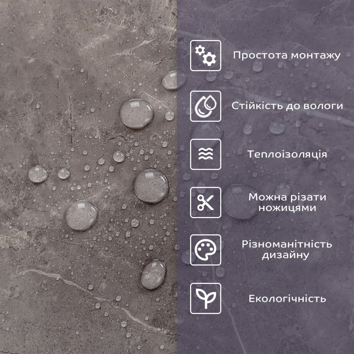 - 2. Стійкість до вологи: матеріал стійкий до впливу вологи та пари, а також до появи плісняви, що робить його придатним для використання у приміщеннях з високою вологістю, таких як ванни та кухні. Плитка підходить для створення фартуха кухні, можна клеїти біля плити на відстані не менше ніж 20-25 см;
