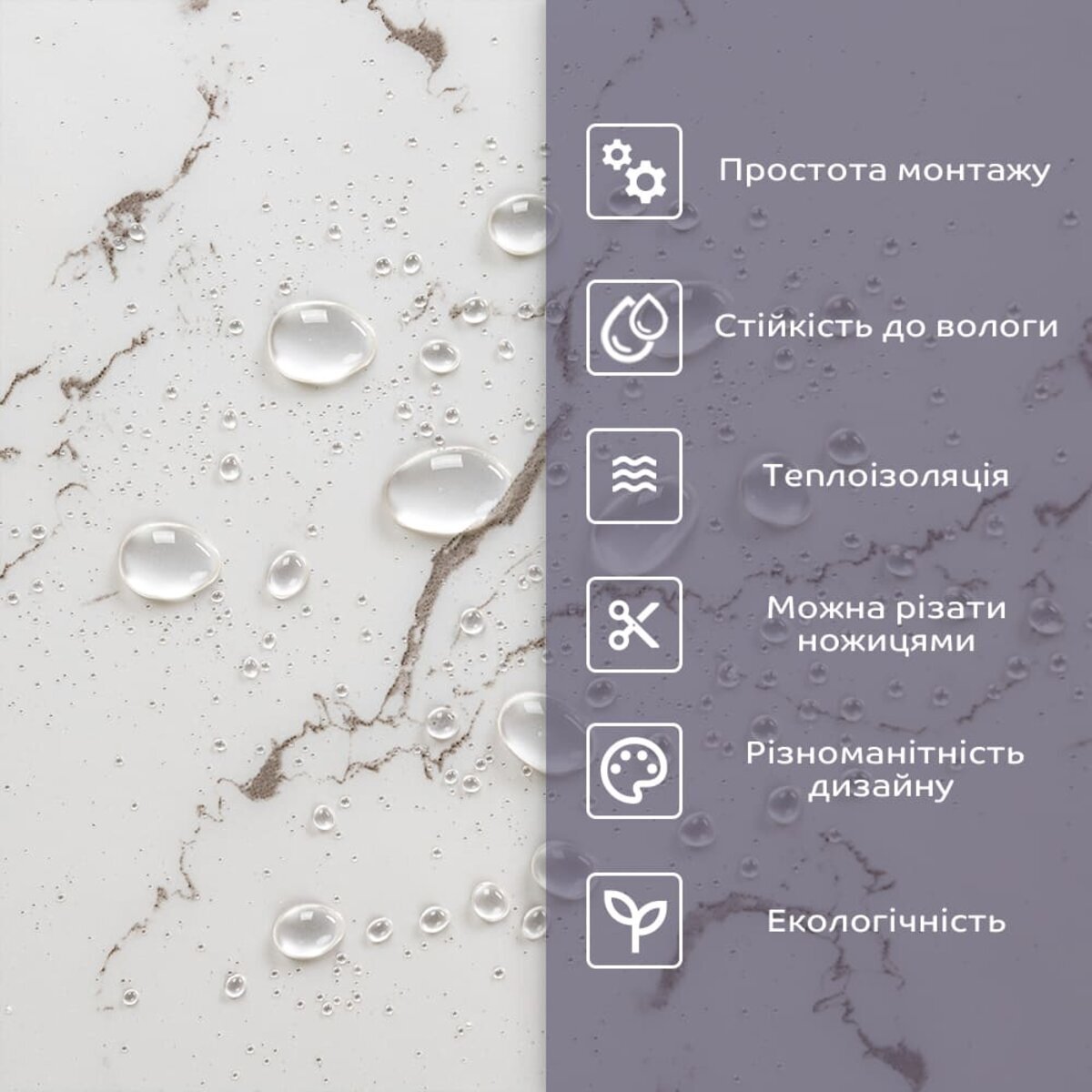 - 1. Легкість та міцність: плитка легка та міцна, що спрощує її логістику, установку та забезпечує довгий термін служби. Матеріал легкий в установці, можна різати ножицями чи монтажним ножем, не потребує додаткових матеріалів чи спеціалістів. Між смугами не розходиться, не роздмухується і не деформується. Відсоток обрізу становить 1%, що є найкращим показником для настінних покриттів;