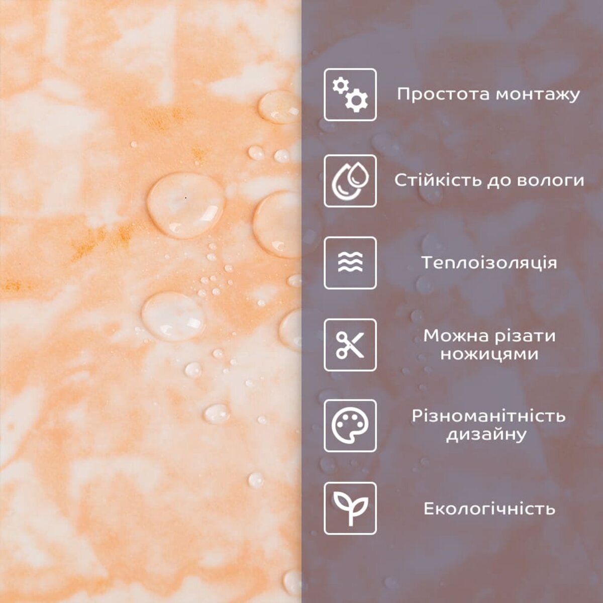 - 2. Стійкість до вологи: матеріал стійкий до впливу вологи та пари, а також до появи плісняви, що робить його придатним для використання у приміщеннях з високою вологістю, таких як ванни та кухні. Плитка підходить для створення фартуха кухні, можна клеїти біля плити на відстані не менше ніж 20-25 см;