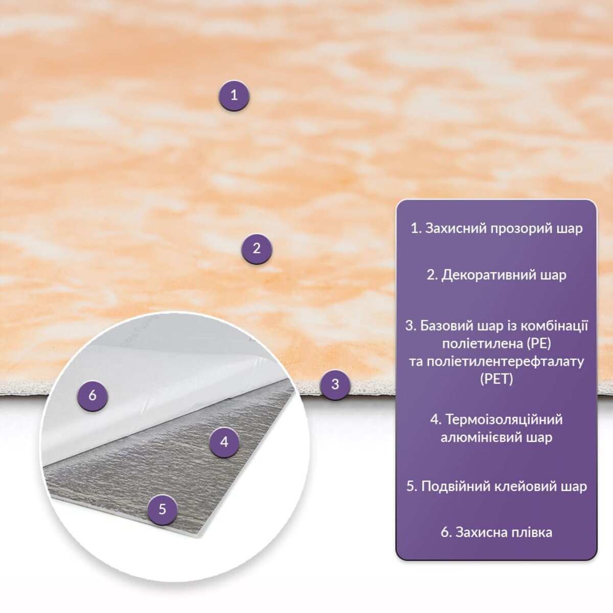 Як і в натуральних матеріалах, малюнки РЕТ плиток можуть трохи відрізнятися між собою, зберігаючи при цьому загальний дизайн та колір, що ще більше підкреслює природну імітацію. Також просимо взяти до уваги, що виробник має право змінювати зовнішній вигляд товару, зокрема відтінок та малюнок, на власний розсуд і без попереднього повідомлення.Шари матеріалу: