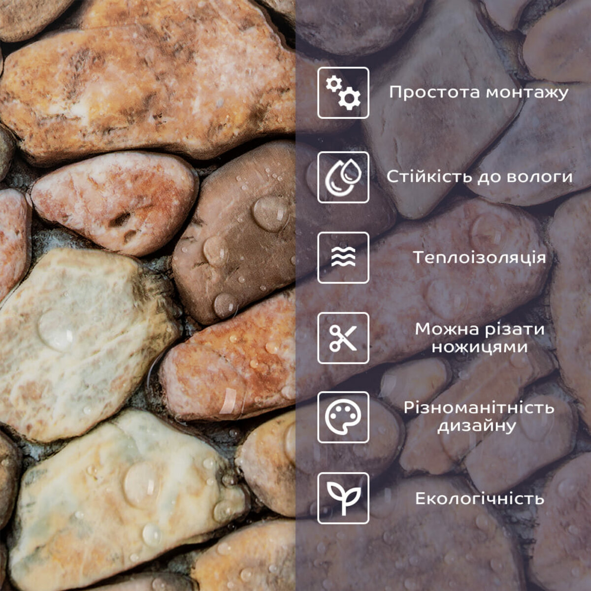 - 1. Легкість та міцність: плитка легка та міцна, що спрощує її логістику, установку та забезпечує довгий термін служби. Матеріал легкий в установці, можна різати ножицями чи монтажним ножем, не потребує додаткових матеріалів чи спеціалістів. Між смугами не розходиться, не роздмухується і не деформується. Відсоток обрізу становить 1%, що є найкращим показником для настінних покриттів;