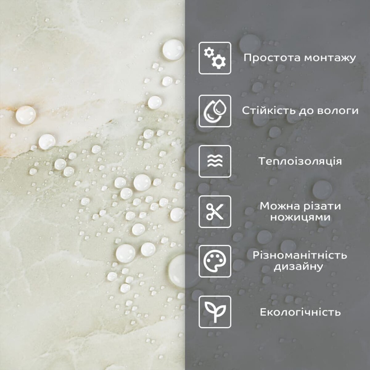- 1. Легкість та міцність: плитка легка та міцна, що спрощує її логістику, установку та забезпечує довгий термін служби. Матеріал легкий в установці, можна різати ножицями чи монтажним ножем, не потребує додаткових матеріалів чи спеціалістів. Між смугами не розходиться, не роздмухується і не деформується. Відсоток обрізу становить 1%, що є найкращим показником для настінних покриттів;