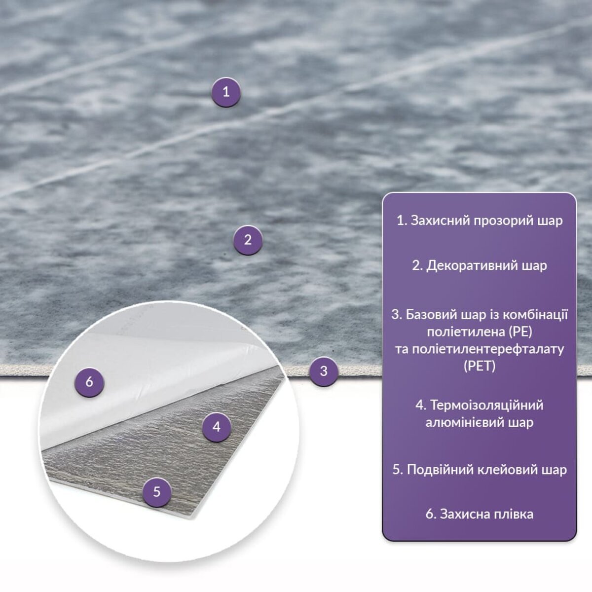 Як і в натуральних матеріалах, малюнки РЕТ плиток можуть трохи відрізнятися між собою, зберігаючи при цьому загальний дизайн та колір, що ще більше підкреслює природну імітацію. Також просимо взяти до уваги, що виробник має право змінювати зовнішній вигляд товару, зокрема відтінок та малюнок, на власний розсуд і без попереднього повідомлення.Шари матеріалу: