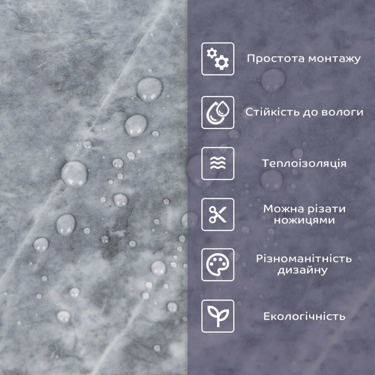 - 1. Легкість та міцність: плитка легка та міцна, що спрощує її логістику, установку та забезпечує довгий термін служби. Матеріал легкий в установці, можна різати ножицями чи монтажним ножем, не потребує додаткових матеріалів чи спеціалістів. Між смугами не розходиться, не роздмухується і не деформується. Відсоток обрізу становить 1%, що є найкращим показником для настінних покриттів;