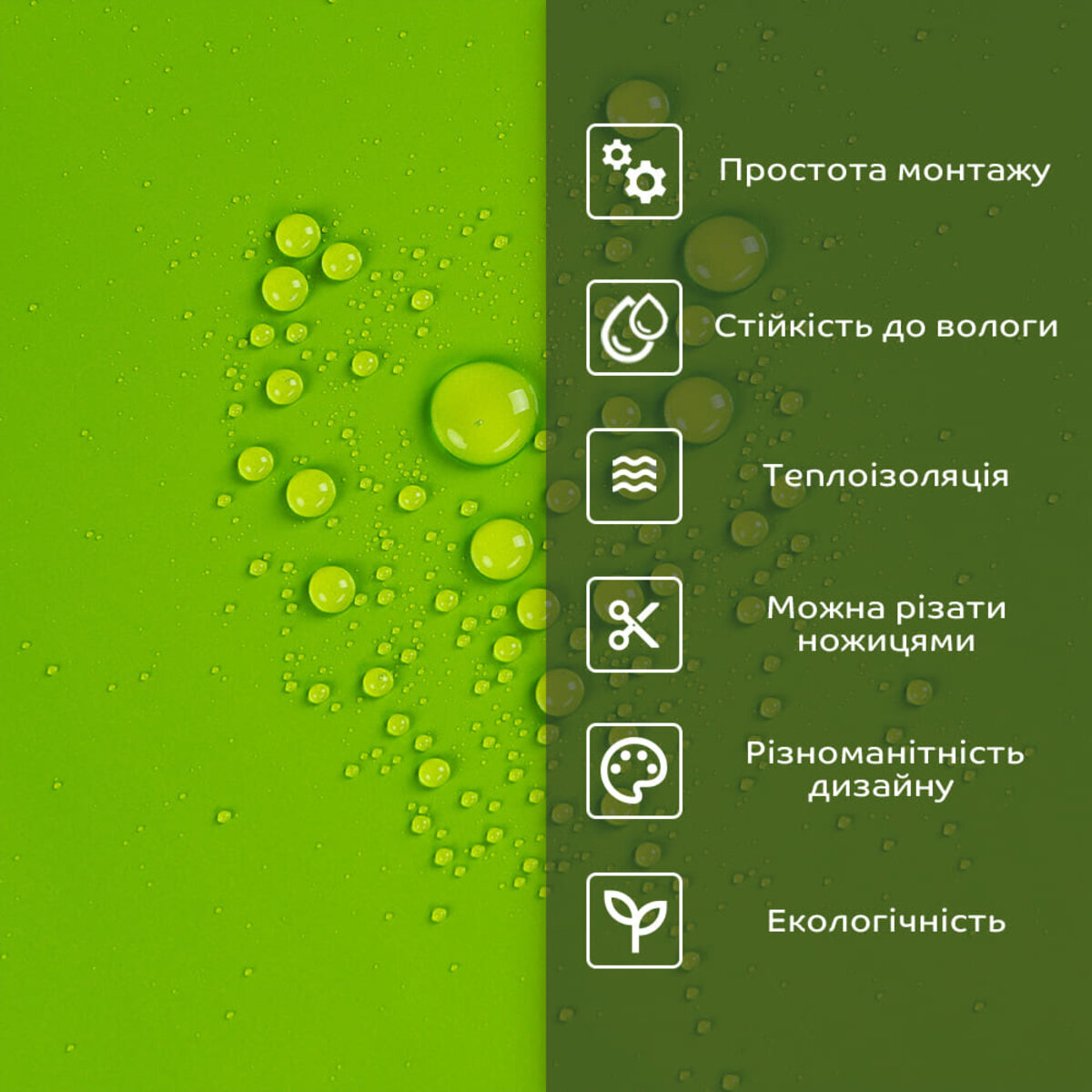 - 1. Легкість та міцність: плитка легка та міцна, що спрощує її логістику, установку та забезпечує довгий термін служби. Матеріал легкий в установці, можна різати ножицями чи монтажним ножем, не потребує додаткових матеріалів чи спеціалістів. Між смугами не розходиться, не роздмухується і не деформується. Відсоток обрізу становить 1%, що є найкращим показником для настінних покриттів;