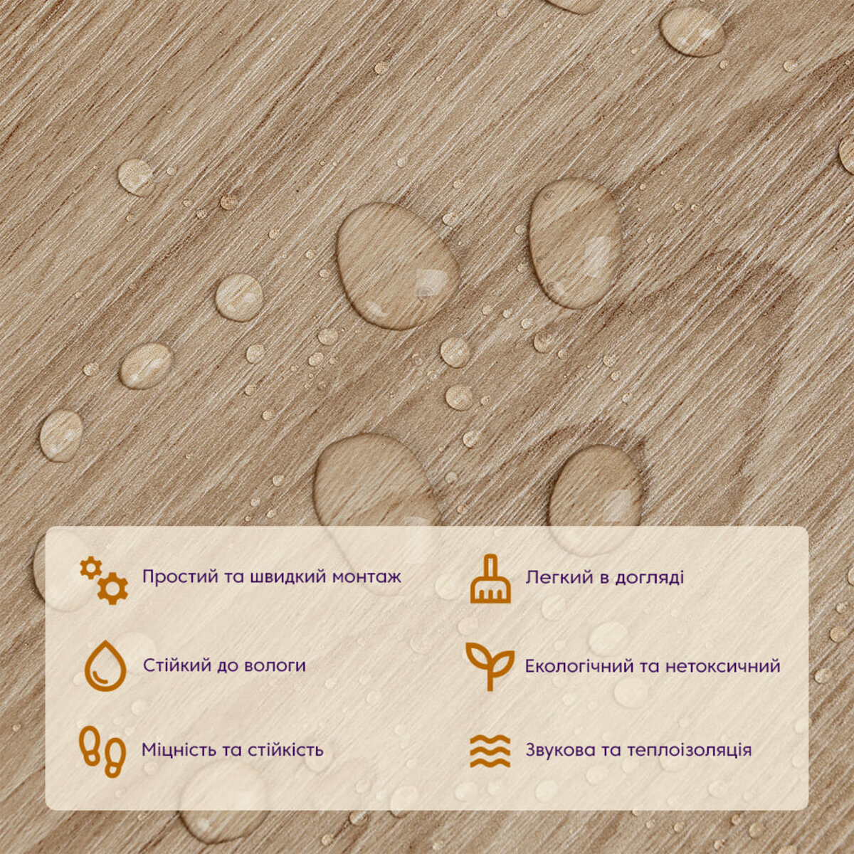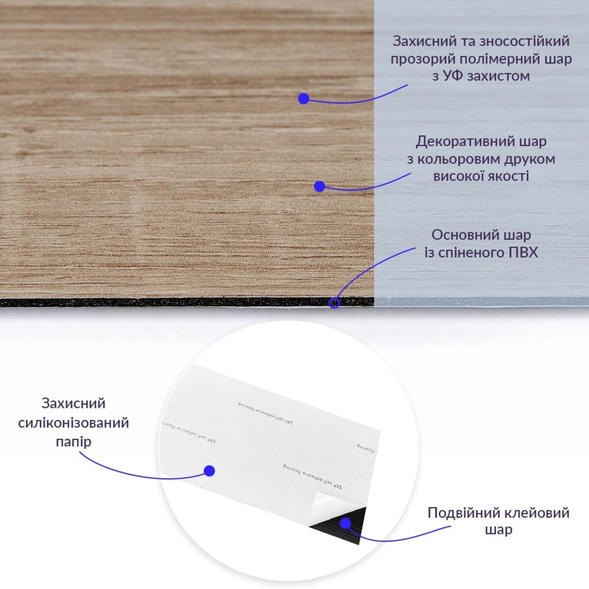 Полімерний шар (прозорий), що захищає від потертостей та дрібних механічних пошкоджень, забезпечує довговічність використання, а УФ захист допомагає запобігти вигоранню, зберігаючи колір насиченим, внаслідок чого вініловий ламінат довго має свій первісний естетичний вигляд. Декоративний шар: плівка з кольоровим друком високої якості, яка повністю імітує фактуру природних матеріалів завдяки чіткому та деталізованому зображенню. Основний шар зі спіненого полівінілхлориду (ПВХ) - це полімер, що складається з довгих ланцюгів молекул вінілхлориду, в яких містяться атоми хлору, це надає матеріалу стійкість до впливу хімічних речовин. ПВХ є аморфним полімером, така особливість будови робить його пружним та ударостійким, а завдяки стабілізаторам та пом'якшувачам, матеріал має амортизаційні властивості та малу вагу. Фольгований шар: основна властивість цього шару – відображення теплових хвиль, що дозволяє мінімізувати теплові втрати, тим самим покращити теплоізоляцію приміщення. Клейовий шар: нетоксична основа з високим рівнем адгезії. Захисний силіконізований папір – оберігає клейовий шар від пересихання та забруднення, легко знімається під час монтажу. Температурний режим: під дією високих температур може змінювати форму. У кухонній зоні поряд з джерелами вогню встановлення плитки необхідно проводити на відстані 30-50 см.