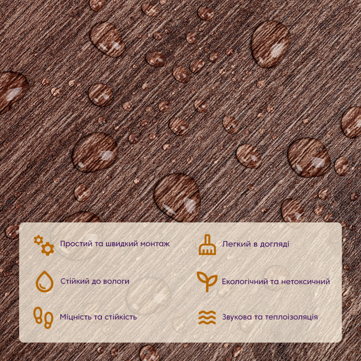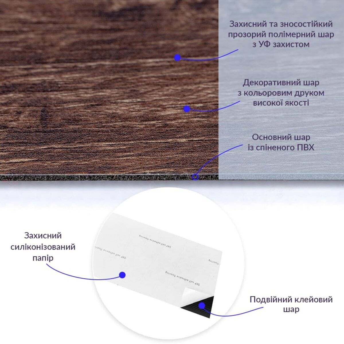 Полімерний шар (прозорий), що захищає від потертостей та дрібних механічних пошкоджень, забезпечує довговічність використання, а УФ захист допомагає запобігти вигоранню, зберігаючи колір насиченим, внаслідок чого вініловий ламінат довго має свій первісний естетичний вигляд. Декоративний шар: плівка з кольоровим друком високої якості, яка повністю імітує фактуру природних матеріалів завдяки чіткому та деталізованому зображенню. Основний шар зі спіненого полівінілхлориду (ПВХ) - це полімер, що складається з довгих ланцюгів молекул вінілхлориду, в яких містяться атоми хлору, це надає матеріалу стійкість до впливу хімічних речовин. ПВХ є аморфним полімером, така особливість будови робить його пружним та ударостійким, а завдяки стабілізаторам та пом'якшувачам, матеріал має амортизаційні властивості та малу вагу. Клейовий шар: нетоксична основа з високим рівнем адгезії. Захисний силіконізований папір – оберігає клейовий шар від пересихання та забруднення, легко знімається під час монтажу. Температурний режим: під дією високих температур може змінювати форму. У кухонній зоні поряд з джерелами вогню встановлення плитки необхідно проводити на відстані 30-50 см.