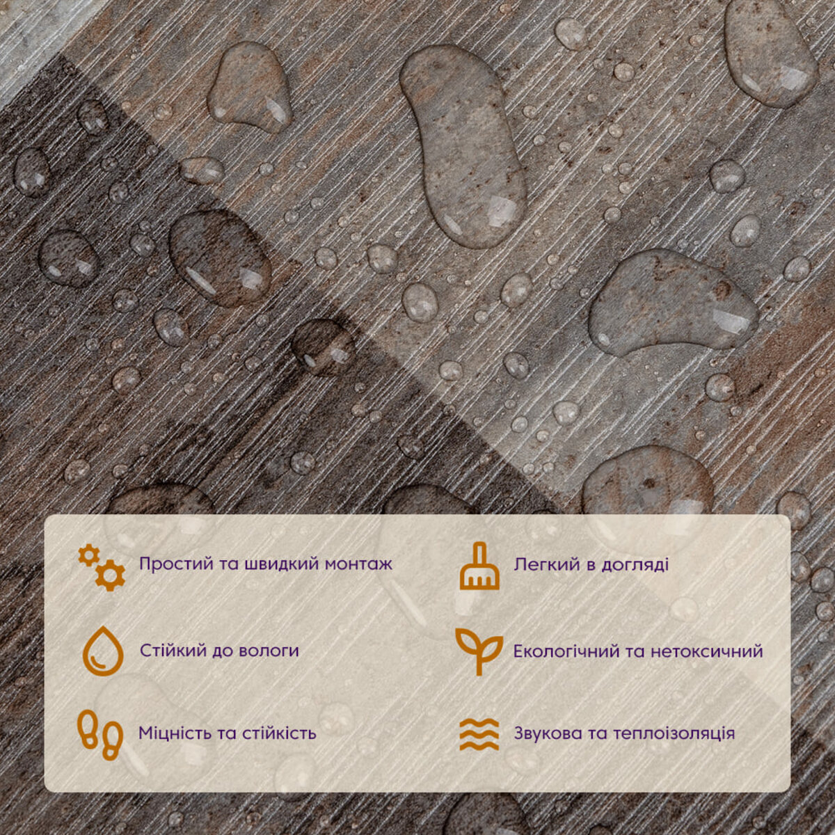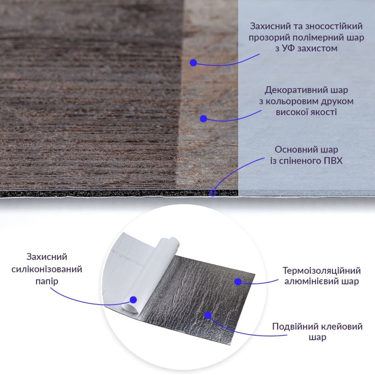 Полімерний шар (прозорий), що захищає від потертостей та дрібних механічних пошкоджень, забезпечує довговічність використання, а УФ захист допомагає запобігти вигоранню, зберігаючи колір насиченим, внаслідок чого вініловий ламінат довго має свій первісний естетичний вигляд. Декоративний шар: плівка з кольоровим друком високої якості, яка повністю імітує фактуру природних матеріалів завдяки чіткому та деталізованому зображенню. Основний шар зі спіненого полівінілхлориду (ПВХ) - це полімер, що складається з довгих ланцюгів молекул вінілхлориду, в яких містяться атоми хлору, це надає матеріалу стійкість до впливу хімічних речовин. ПВХ є аморфним полімером, така особливість будови робить його пружним та ударостійким, а завдяки стабілізаторам та пом'якшувачам, матеріал має амортизаційні властивості та малу вагу. Фольгований шар: основна властивість цього шару – відображення теплових хвиль, що дозволяє мінімізувати теплові втрати, тим самим покращити теплоізоляцію приміщення. Клейовий шар: нетоксична основа з високим рівнем адгезії. Захисний силіконізований папір – оберігає клейовий шар від пересихання та забруднення, легко знімається під час монтажу. Температурний режим: під дією високих температур може змінювати форму. У кухонній зоні поряд з джерелами вогню встановлення плитки необхідно проводити на відстані 30-50 см.