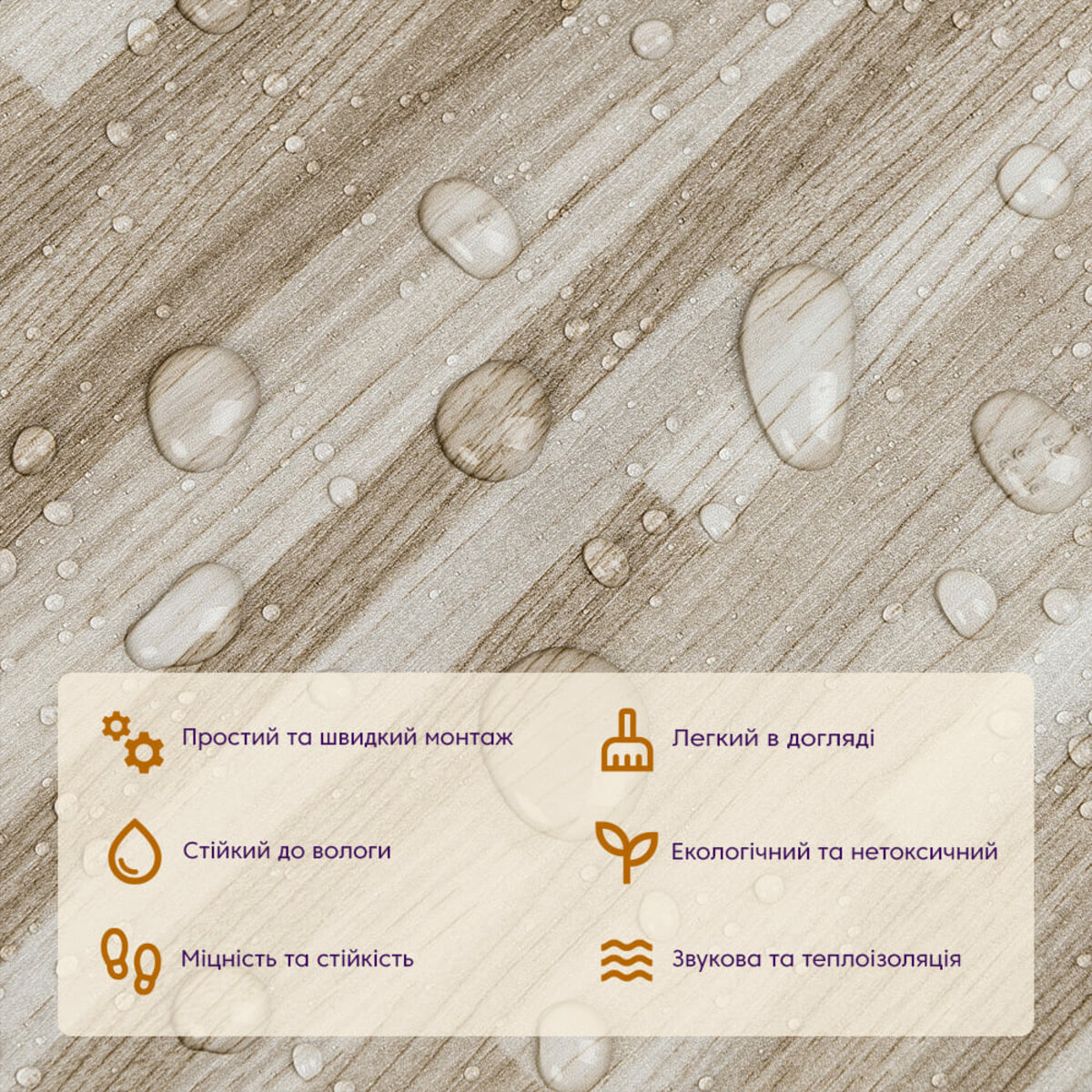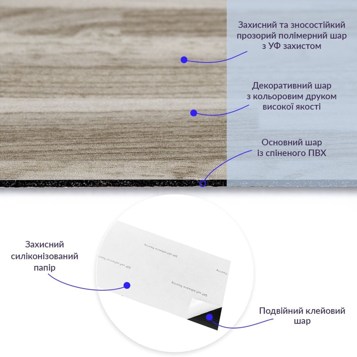 Полімерний шар (прозорий), що захищає від потертостей та дрібних механічних пошкоджень, забезпечує довговічність використання, а УФ захист допомагає запобігти вигоранню, зберігаючи колір насиченим, внаслідок чого вініловий ламінат довго має свій первісний естетичний вигляд. Декоративний шар: плівка з кольоровим друком високої якості, яка повністю імітує фактуру природних матеріалів завдяки чіткому та деталізованому зображенню. Основний шар зі спіненого полівінілхлориду (ПВХ) - це полімер, що складається з довгих ланцюгів молекул вінілхлориду, в яких містяться атоми хлору, це надає матеріалу стійкість до впливу хімічних речовин. ПВХ є аморфним полімером, така особливість будови робить його пружним та ударостійким, а завдяки стабілізаторам та пом'якшувачам, матеріал має амортизаційні властивості та малу вагу. Клейовий шар: нетоксична основа з високим рівнем адгезії. Захисний силіконізований папір – оберігає клейовий шар від пересихання та забруднення, легко знімається під час монтажу. Температурний режим: під дією високих температур може змінювати форму. У кухонній зоні поряд з джерелами вогню встановлення плитки необхідно проводити на відстані 30-50 см.