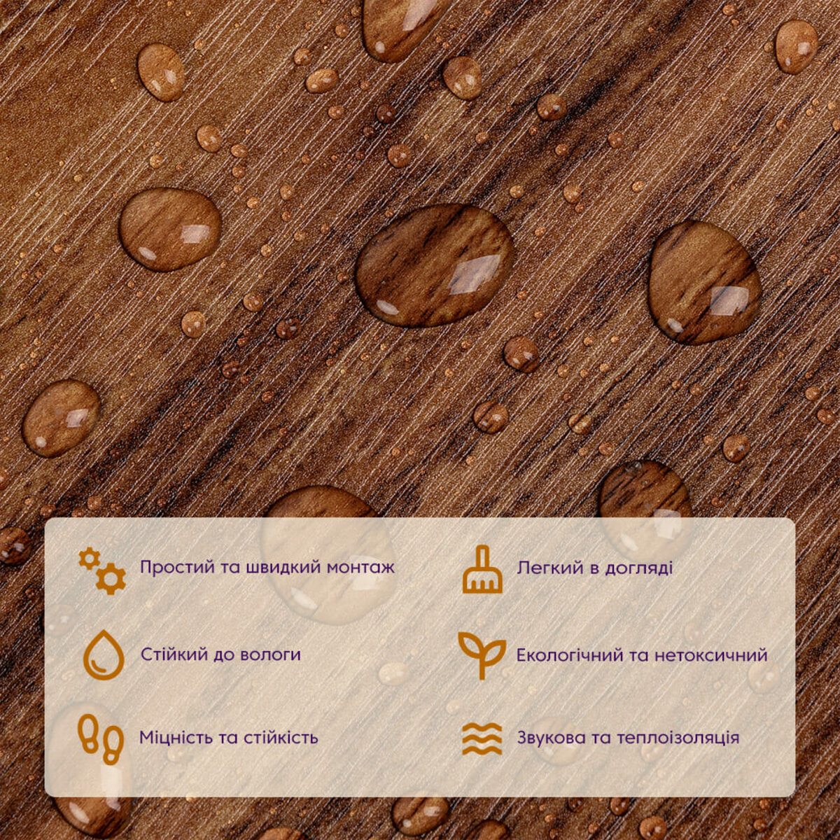 Легка установка: низька вага матеріалу спрощує процес транспортування та монтажу, а клейовий шар робить процес укладання швидким, не вимагаючи додаткових матеріалів чи спеціалістів. Матеріал укладається стик в стик, його можна різати ножицями чи монтажним ножем, між смугами не розходиться, не набухає і не деформується. Відсоток обрізу становить 1%, що є найкращим показником для настінних покриттів. Стійкість до вологи: вінілова плитка під ламінат стійка до вологи, що робить її відмінним вибором для кухні та інших приміщень з підвищеною вологістю, матеріал стійкий також до впливу пари та до появи плісняви. Міцність та стійкість: полімерний шар захищає від потертостей та механічних пошкоджень, забезпечуючи довговічність використання. Додатковий захист від УФ-променів допомагає уникнути вигоряння та зберігає колір насиченим. Естетика: широкий вибір дизайнів, що імітують натуральні матеріали, дає можливість підібрати покриття, яке відповідає вашому стилю та інтер'єру, дуже добре комбінується за гамою кольорів, дозволяючи створити власний дизайн приміщення. Легкий догляд: вініл легко очищається і не вимагає спеціальних засобів. У разі пошкодження окремої плитки ви можете легко замінити її без необхідності великого ремонту. Звукоізоляція: конструкція шарів забезпечує додаткову звукоізоляцію та робить помешкання більш комфортними. Екологічна безпека: вінілова плитка під ламінат не містить токсичних речовин і виготовляється з відновлювальних ресурсів, що робить її безпечною для здоров'я та довкілля. Розрахунок потрібної кількості матеріалу: