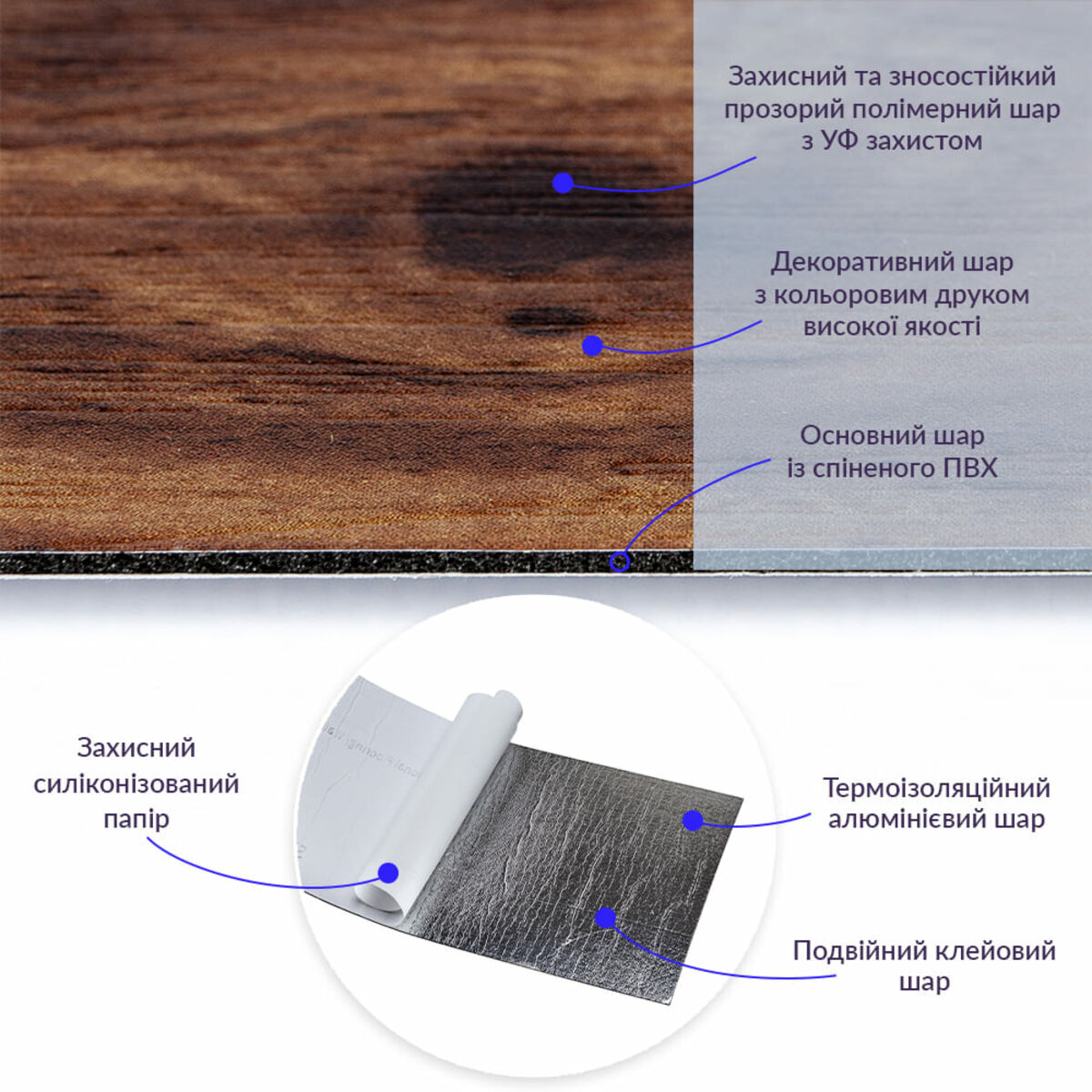 Полімерний шар (прозорий), що захищає від потертостей та дрібних механічних пошкоджень, забезпечує довговічність використання, а УФ захист допомагає запобігти вигоранню, зберігаючи колір насиченим, внаслідок чого вініловий ламінат довго має свій первісний естетичний вигляд. Декоративний шар: плівка з кольоровим друком високої якості, яка повністю імітує фактуру природних матеріалів завдяки чіткому та деталізованому зображенню. Основний шар зі спіненого полівінілхлориду (ПВХ) - це полімер, що складається з довгих ланцюгів молекул вінілхлориду, в яких містяться атоми хлору, це надає матеріалу стійкість до впливу хімічних речовин. ПВХ є аморфним полімером, така особливість будови робить його пружним та ударостійким, а завдяки стабілізаторам та пом'якшувачам, матеріал має амортизаційні властивості та малу вагу. Фольгований шар: основна властивість цього шару – відображення теплових хвиль, що дозволяє мінімізувати теплові втрати, тим самим покращити теплоізоляцію приміщення. Клейовий шар: нетоксична основа з високим рівнем адгезії. Захисний силіконізований папір – оберігає клейовий шар від пересихання та забруднення, легко знімається під час монтажу. Температурний режим: під дією високих температур може змінювати форму. У кухонній зоні поряд з джерелами вогню встановлення плитки необхідно проводити на відстані 30-50 см.