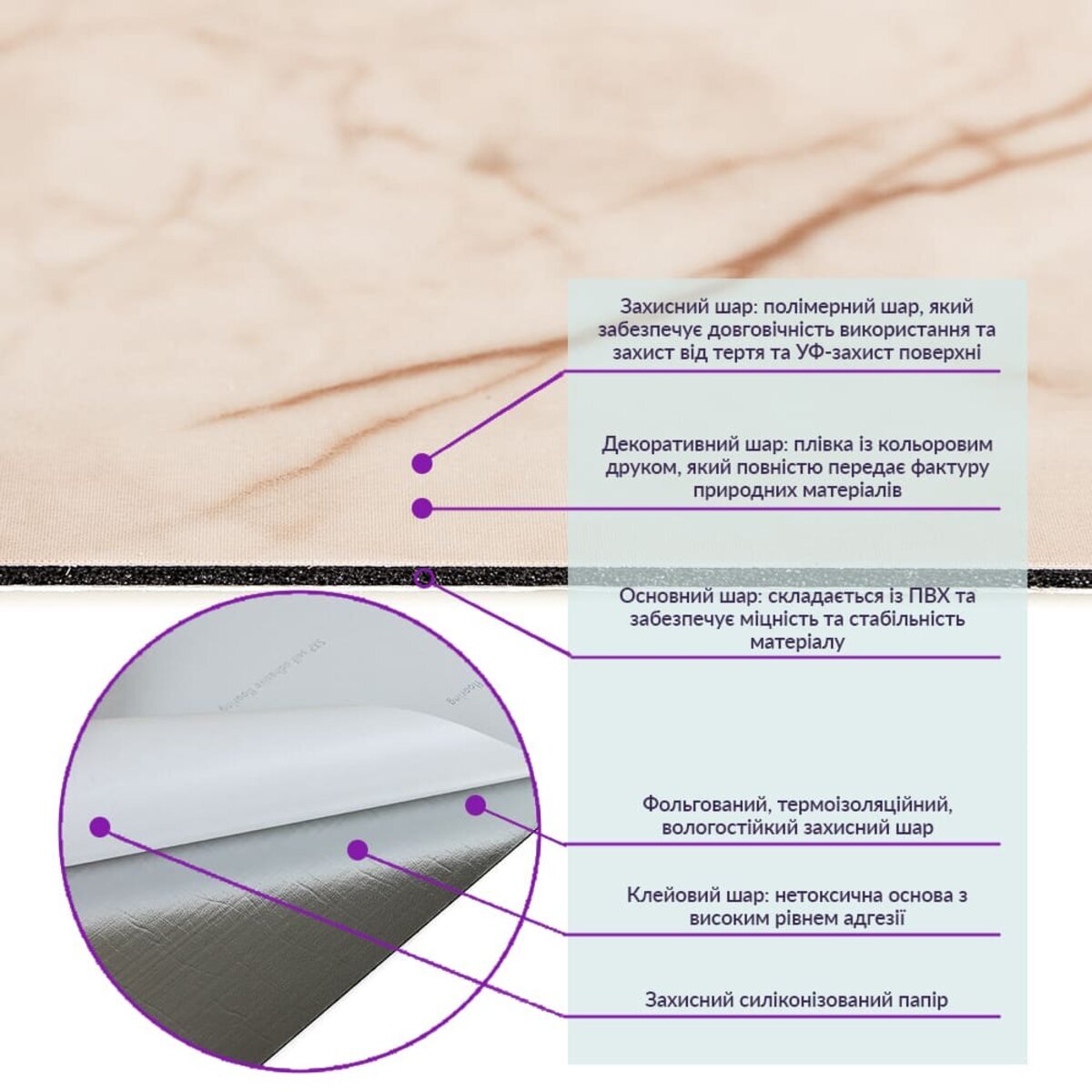 - Декоративний шар: плівка з кольоровим друком високої якості, яка повністю імітує фактуру природних матеріалів завдяки чіткому та деталізованому зображенню.
