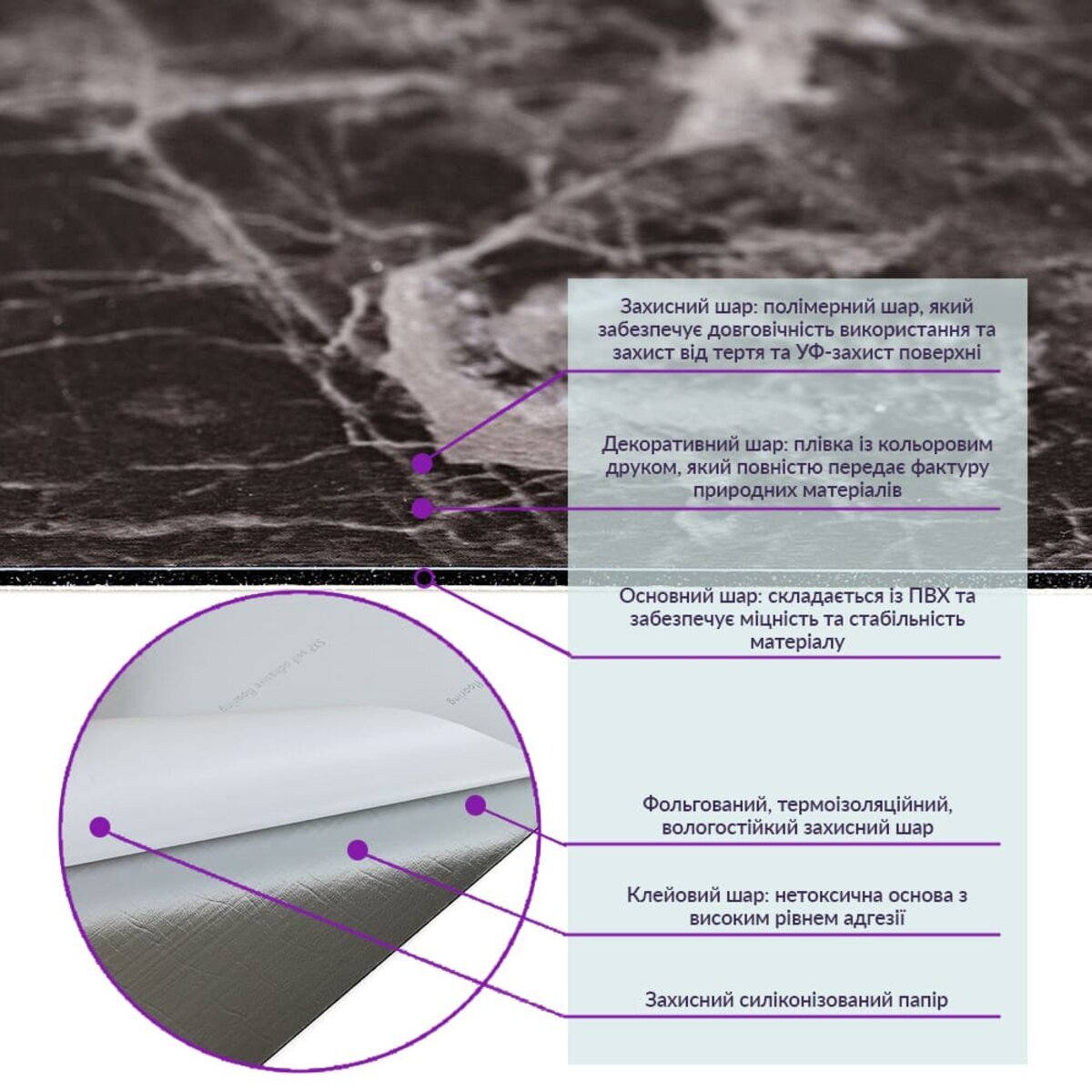 - Полімерний шар: захищає від потертостей та дрібних механічних пошкоджень, забезпечує довговічність використання, а УФ захист допомагає запобігти вигоранню, зберігаючи колір насиченим.