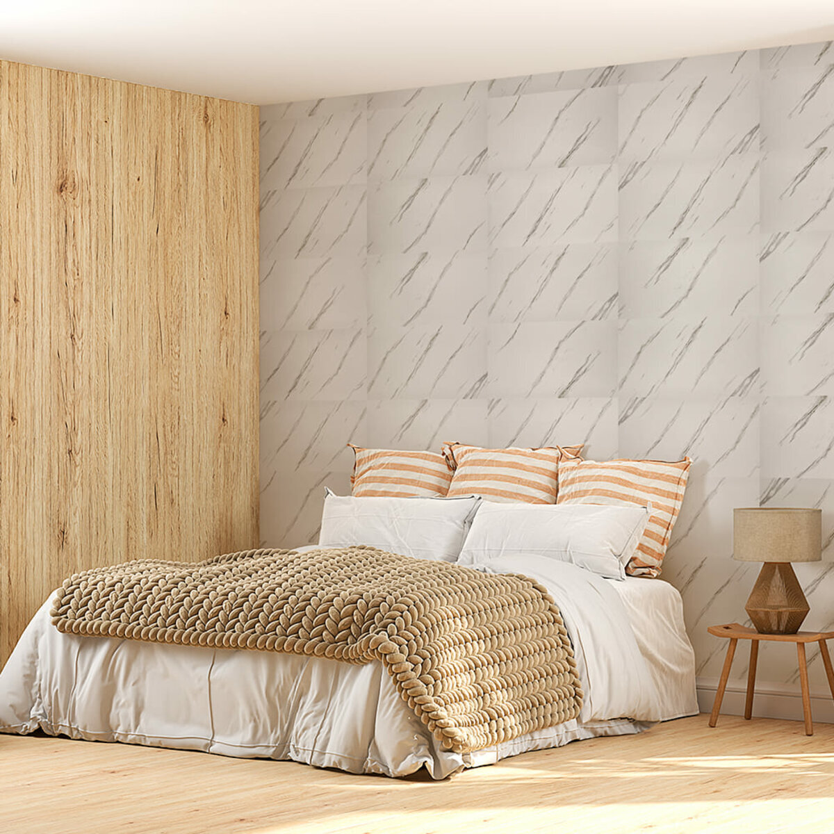 - Легка установка: самоклеючий шар робить процес укладання швидким і простим, не вимагаючи додаткового клею, додаткових матеріалів чи спеціалістів. Матеріал укладається стик в стик, його можна різати ножицями чи монтажним ножем, між смугами не розходиться, не набухає і не деформується. Відсоток обрізу становить 1%, що є найкращим показником для настінних покриттів;