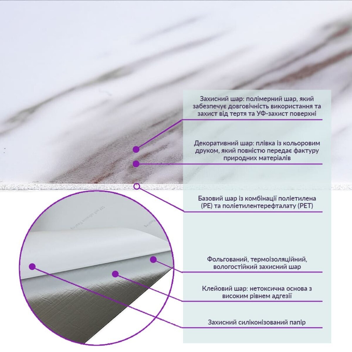 - Декоративний шар: плівка з кольоровим друком високої якості, яка повністю імітує фактуру природних матеріалів завдяки чіткому та деталізованому зображенню.