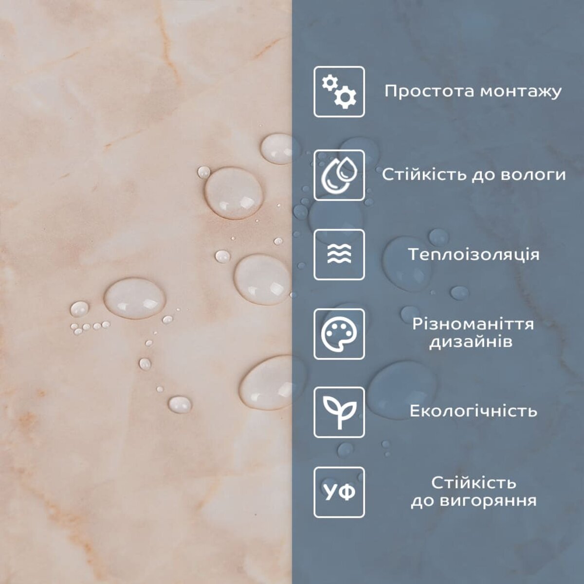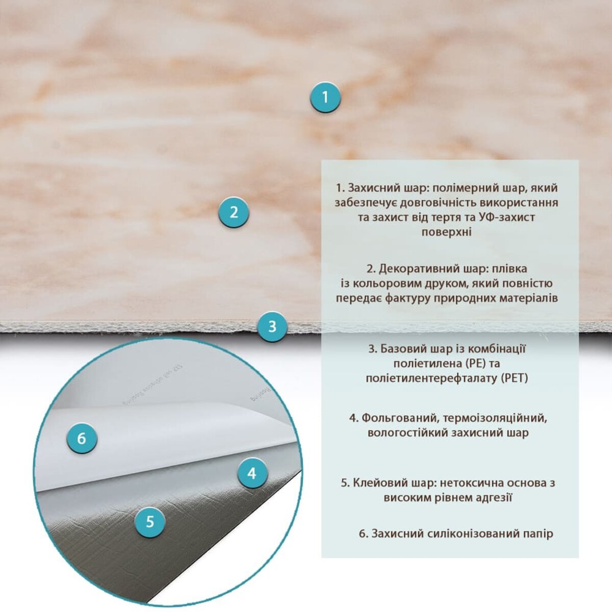 - Декоративний шар: плівка з кольоровим друком високої якості, яка повністю імітує фактуру природних матеріалів завдяки чіткому та деталізованому зображенню.