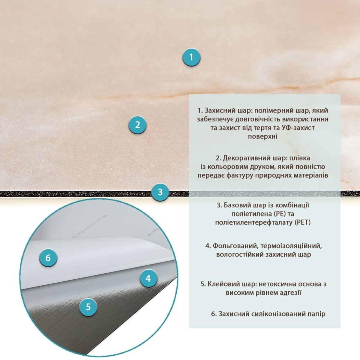 - Полімерний шар: захищає від потертостей та дрібних механічних пошкоджень, забезпечує довговічність використання, а УФ захист допомагає запобігти вигоранню, зберігаючи колір насиченим.