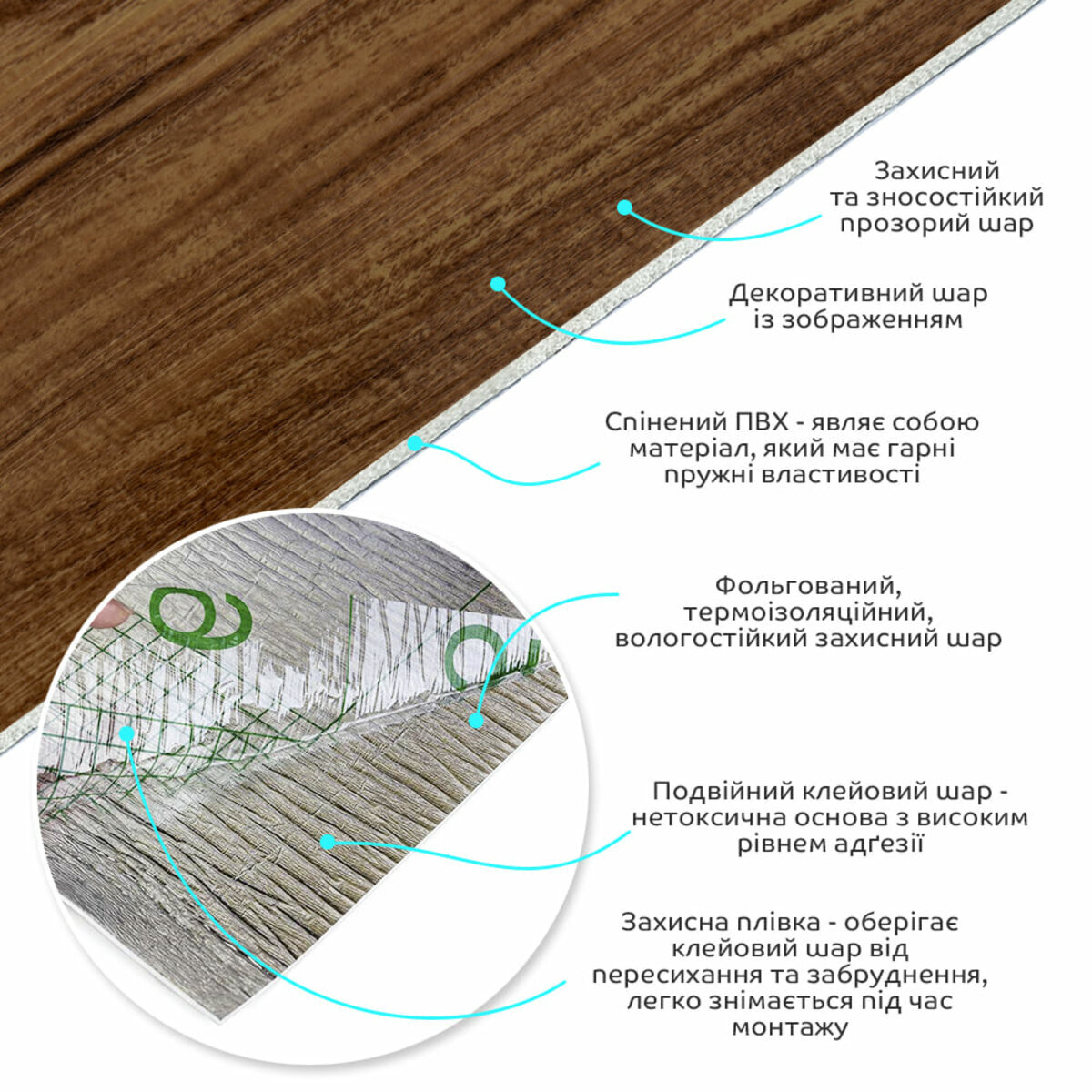 Полімерний шар, що захищає від потертостей та дрібних механічних пошкоджень, забезпечує довговічність використання, а УФ захист допомагає запобігти вигоранню, зберігаючи колір насиченим, за рахунок чого плитка довго має свій первісний естетичний вигляд. Декоративний шар: плівка з кольоровим друком високої роздільної здатності, яка повністю імітує фактуру природних матеріалів завдяки чіткому та детальному зображенню. Основний шар із спіненого полівінілхлориду (ПВХ) – це полімер, що складається з довгих ланцюгів молекул вінілхлориду, в яких містяться атоми хлору, це надає матеріалу стійкість до дії хімічних речовин. ПВХ є аморфним полімером, така особливість будови робить його пружним та ударостійким, а завдяки стабілізаторам та пом'якшувачам, матеріал має малу вагу. Фольгований шар: основна властивість цього шару – відображення теплових хвиль, що дозволяє мінімізувати теплові втрати, тим самим покращити теплоізоляцію приміщення. Клейовий шар: нетоксична основа з високим рівнем адгезії. Захисна плівка – оберігає клейовий шар від пересихання та забруднення, легко знімається під час монтажу. Температурний режим: під впливом високих температур може змінювати форму. У кухонній зоні поруч із джерелами вогню встановлення плитки необхідно проводити на відстані 30-50 см.