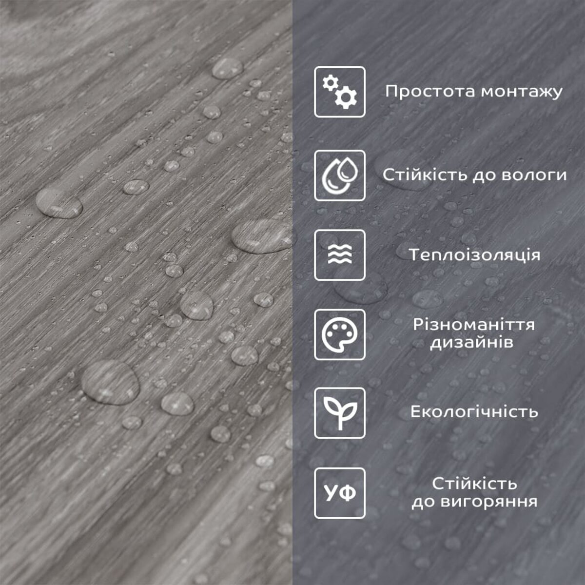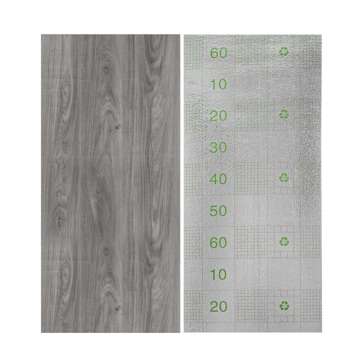 Полімерний шар, що захищає від потертостей та дрібних механічних пошкоджень, забезпечує довговічність використання, а УФ захист допомагає запобігти вигоранню, зберігаючи колір насиченим, за рахунок чого плитка довго має свій первісний естетичний вигляд. Декоративний шар: плівка з кольоровим друком високої роздільної здатності, яка повністю імітує фактуру природних матеріалів завдяки чіткому та детальному зображенню. Основний шар із спіненого полівінілхлориду (ПВХ) – це полімер, що складається з довгих ланцюгів молекул вінілхлориду, в яких містяться атоми хлору, це надає матеріалу стійкість до дії хімічних речовин. ПВХ є аморфним полімером, така особливість будови робить його пружним та ударостійким, а завдяки стабілізаторам та пом'якшувачам, матеріал має малу вагу. Фольгований шар: основна властивість цього шару – відображення теплових хвиль, що дозволяє мінімізувати теплові втрати, тим самим покращити теплоізоляцію приміщення. Клейовий шар: нетоксична основа з високим рівнем адгезії. Захисна плівка – оберігає клейовий шар від пересихання та забруднення, легко знімається під час монтажу. Температурний режим: під впливом високих температур може змінювати форму. У кухонній зоні поруч із джерелами вогню встановлення плитки необхідно проводити на відстані 30-50 см.
