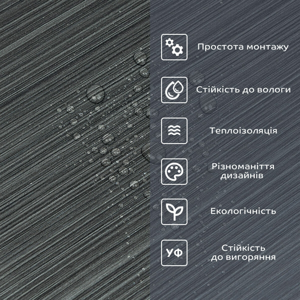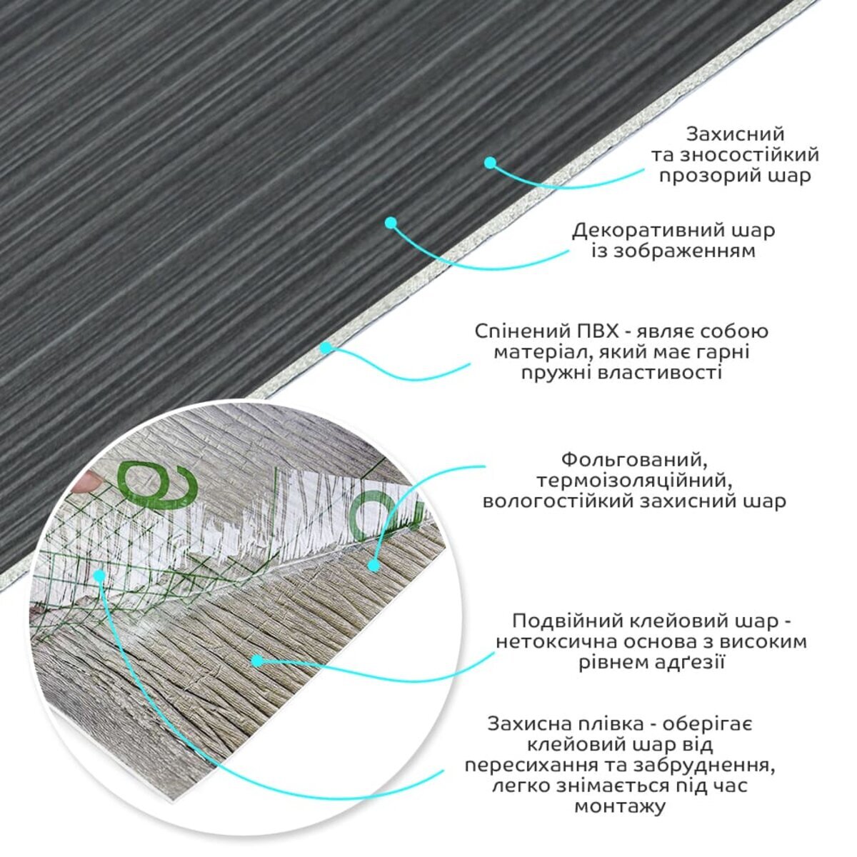 Полімерний шар, що захищає від потертостей та дрібних механічних пошкоджень, забезпечує довговічність використання, а УФ захист допомагає запобігти вигоранню, зберігаючи колір насиченим, за рахунок чого плитка довго має свій первісний естетичний вигляд. Декоративний шар: плівка з кольоровим друком високої роздільної здатності, яка повністю імітує фактуру природних матеріалів завдяки чіткому та детальному зображенню. Основний шар із спіненого полівінілхлориду (ПВХ) – це полімер, що складається з довгих ланцюгів молекул вінілхлориду, в яких містяться атоми хлору, це надає матеріалу стійкість до дії хімічних речовин. ПВХ є аморфним полімером, така особливість будови робить його пружним та ударостійким, а завдяки стабілізаторам та пом'якшувачам, матеріал має малу вагу. Фольгований шар: основна властивість цього шару – відображення теплових хвиль, що дозволяє мінімізувати теплові втрати, тим самим покращити теплоізоляцію приміщення. Клейовий шар: нетоксична основа з високим рівнем адгезії. Захисна плівка – оберігає клейовий шар від пересихання та забруднення, легко знімається під час монтажу. Температурний режим: під впливом високих температур може змінювати форму. У кухонній зоні поруч із джерелами вогню встановлення плитки необхідно проводити на відстані 30-50 см.