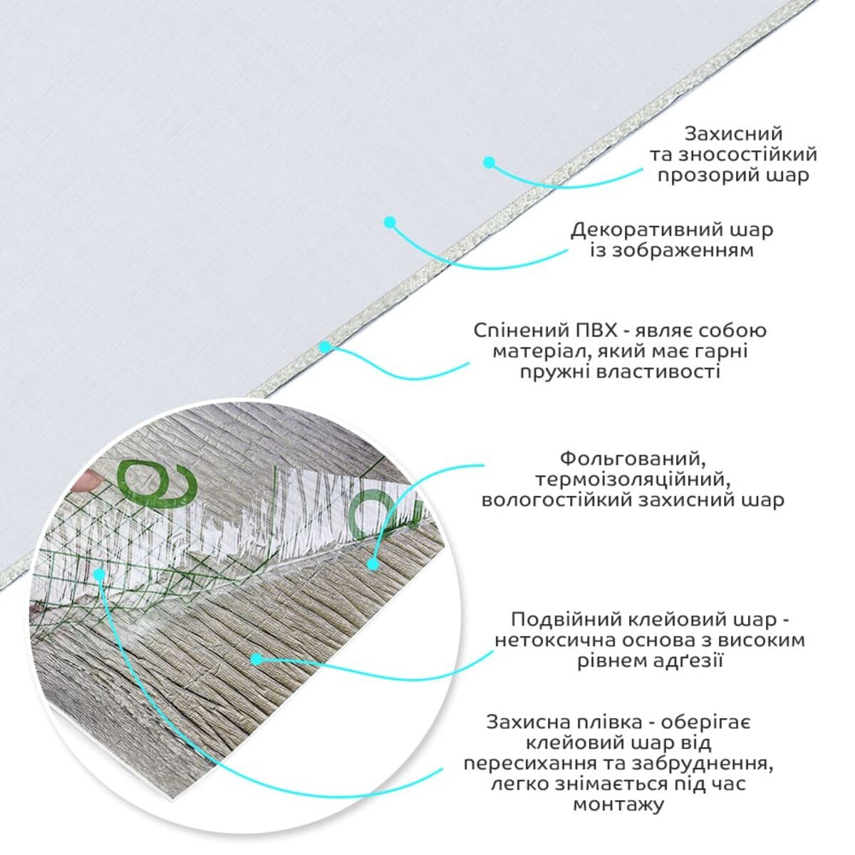 Полімерний шар, що захищає від потертостей та дрібних механічних пошкоджень, забезпечує довговічність використання, а УФ захист допомагає запобігти вигоранню, зберігаючи колір насиченим, за рахунок чого плитка довго має свій первісний естетичний вигляд. Декоративний шар: плівка з кольоровим друком високої роздільної здатності, яка повністю імітує фактуру природних матеріалів завдяки чіткому та детальному зображенню. Основний шар із спіненого полівінілхлориду (ПВХ) – це полімер, що складається з довгих ланцюгів молекул вінілхлориду, в яких містяться атоми хлору, це надає матеріалу стійкість до дії хімічних речовин. ПВХ є аморфним полімером, така особливість будови робить його пружним та ударостійким, а завдяки стабілізаторам та пом'якшувачам, матеріал має малу вагу. Фольгований шар: основна властивість цього шару – відображення теплових хвиль, що дозволяє мінімізувати теплові втрати, тим самим покращити теплоізоляцію приміщення. Клейовий шар: нетоксична основа з високим рівнем адгезії. Захисна плівка – оберігає клейовий шар від пересихання та забруднення, легко знімається під час монтажу. Температурний режим: під впливом високих температур може змінювати форму. У кухонній зоні поруч із джерелами вогню встановлення плитки необхідно проводити на відстані 30-50 см.