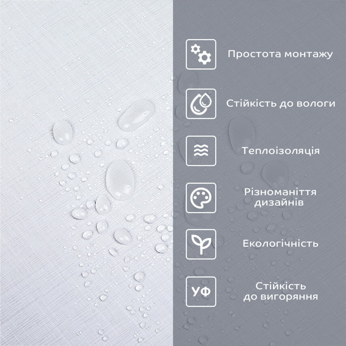 Фактура: рівна, з імітацією натуральних матеріалів. Поверхня глянсова або матова.