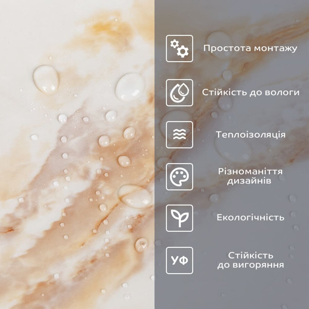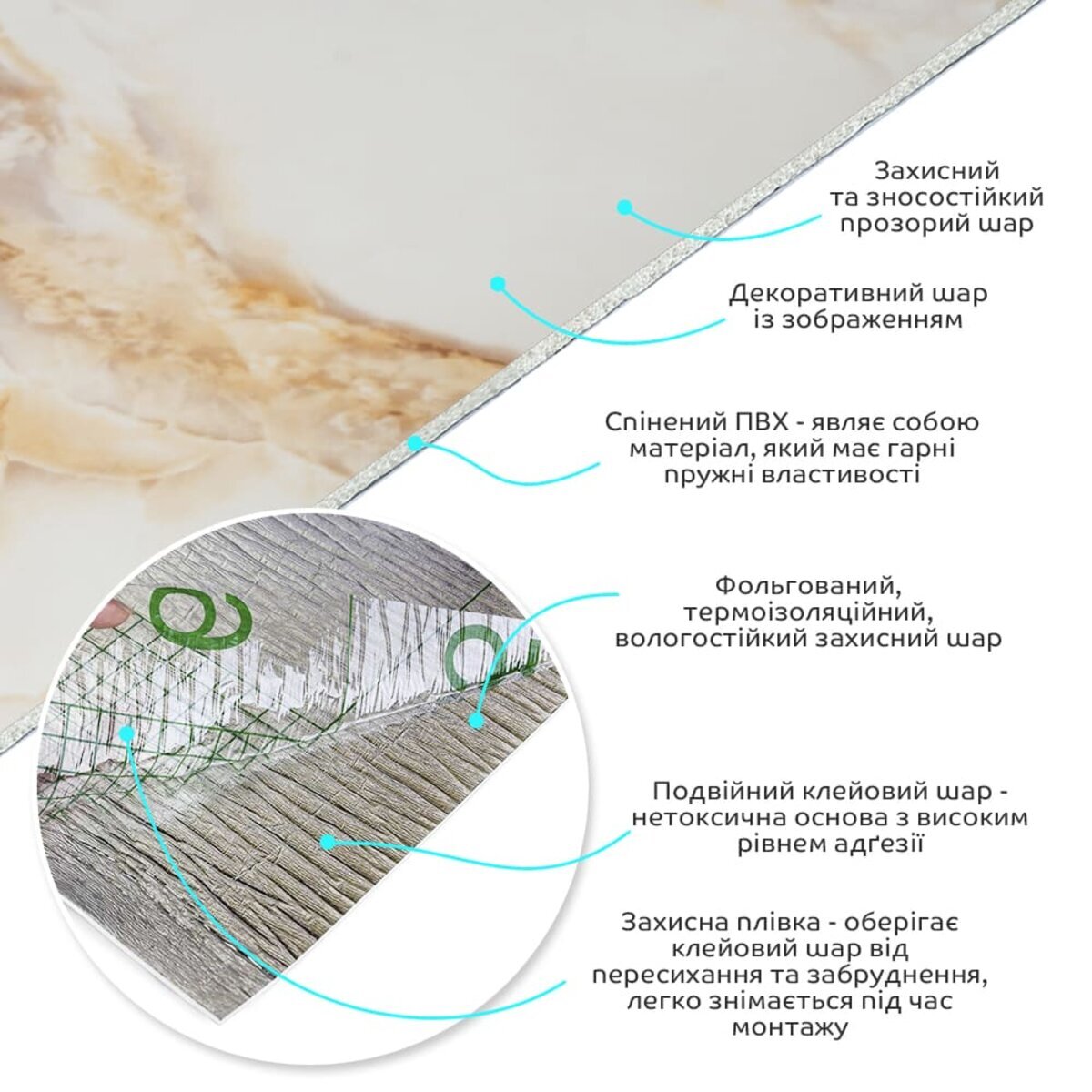 Полімерний шар, що захищає від потертостей та дрібних механічних пошкоджень, забезпечує довговічність використання, а УФ захист допомагає запобігти вигоранню, зберігаючи колір насиченим, за рахунок чого плитка довго має свій первісний естетичний вигляд. Декоративний шар: плівка з кольоровим друком високої роздільної здатності, яка повністю імітує фактуру природних матеріалів завдяки чіткому та детальному зображенню. Основний шар із спіненого полівінілхлориду (ПВХ) – це полімер, що складається з довгих ланцюгів молекул вінілхлориду, в яких містяться атоми хлору, це надає матеріалу стійкість до дії хімічних речовин. ПВХ є аморфним полімером, така особливість будови робить його пружним та ударостійким, а завдяки стабілізаторам та пом'якшувачам, матеріал має малу вагу. Фольгований шар: основна властивість цього шару – відображення теплових хвиль, що дозволяє мінімізувати теплові втрати, тим самим покращити теплоізоляцію приміщення. Клейовий шар: нетоксична основа з високим рівнем адгезії. Захисна плівка – оберігає клейовий шар від пересихання та забруднення, легко знімається під час монтажу. Температурний режим: під впливом високих температур може змінювати форму. У кухонній зоні поруч із джерелами вогню встановлення плитки необхідно проводити на відстані 30-50 см.