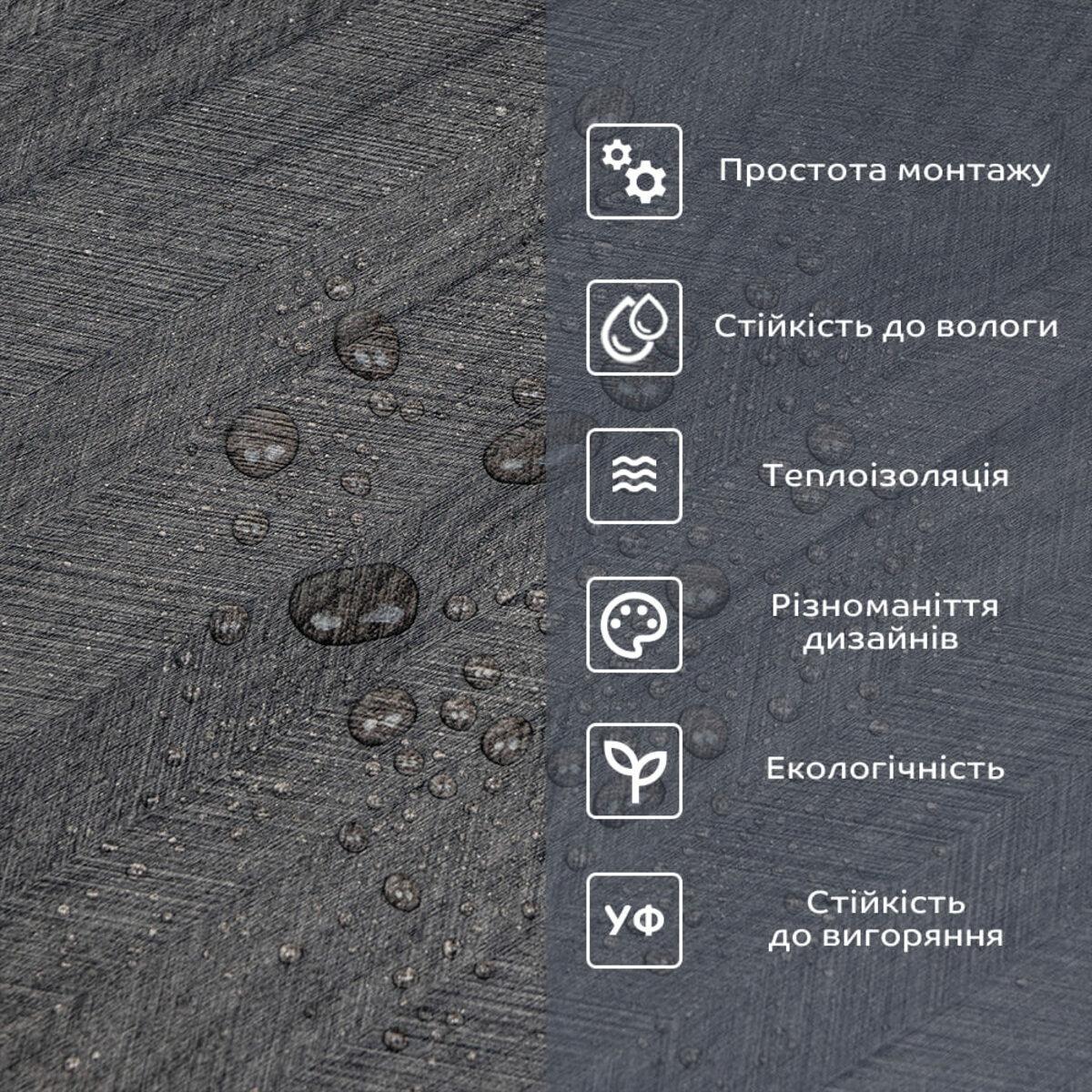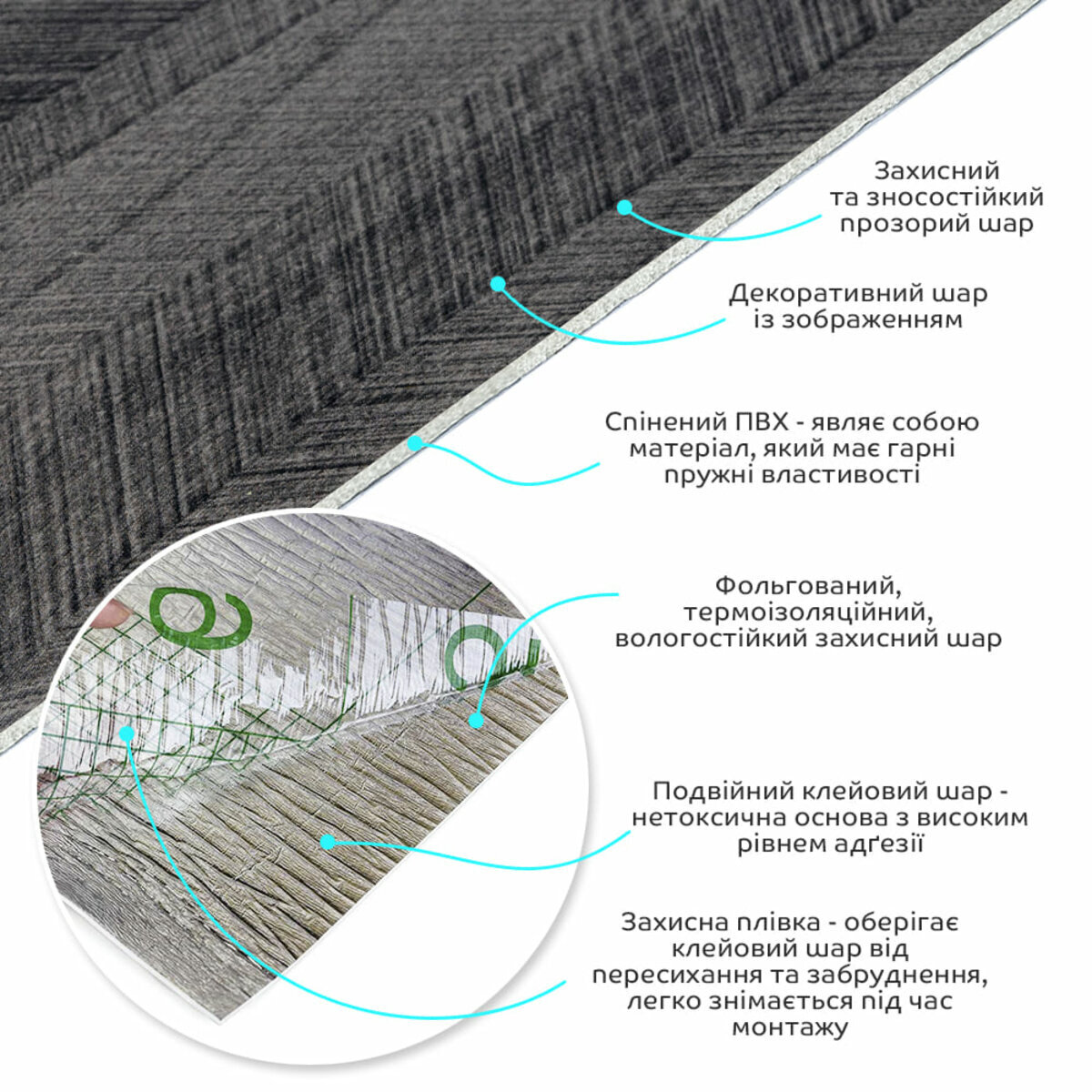 Полімерний шар, що захищає від потертостей та дрібних механічних пошкоджень, забезпечує довговічність використання, а УФ захист допомагає запобігти вигоранню, зберігаючи колір насиченим, за рахунок чого плитка довго має свій первісний естетичний вигляд. Декоративний шар: плівка з кольоровим друком високої роздільної здатності, яка повністю імітує фактуру природних матеріалів завдяки чіткому та детальному зображенню. Основний шар із спіненого полівінілхлориду (ПВХ) – це полімер, що складається з довгих ланцюгів молекул вінілхлориду, в яких містяться атоми хлору, це надає матеріалу стійкість до дії хімічних речовин. ПВХ є аморфним полімером, така особливість будови робить його пружним та ударостійким, а завдяки стабілізаторам та пом'якшувачам, матеріал має малу вагу. Фольгований шар: основна властивість цього шару – відображення теплових хвиль, що дозволяє мінімізувати теплові втрати, тим самим покращити теплоізоляцію приміщення. Клейовий шар: нетоксична основа з високим рівнем адгезії. Захисна плівка – оберігає клейовий шар від пересихання та забруднення, легко знімається під час монтажу. Температурний режим: під впливом високих температур може змінювати форму. У кухонній зоні поруч із джерелами вогню встановлення плитки необхідно проводити на відстані 30-50 см.