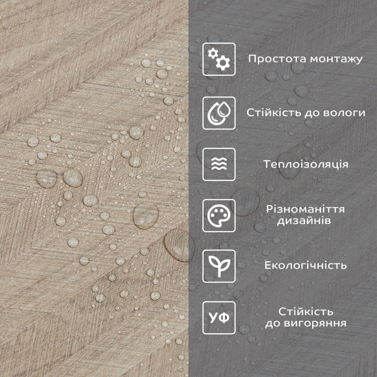 Фактура: рівна, з імітацією натуральних матеріалів. Поверхня матова.