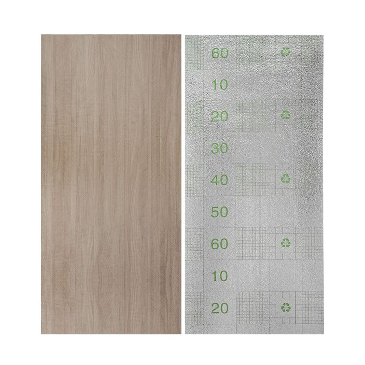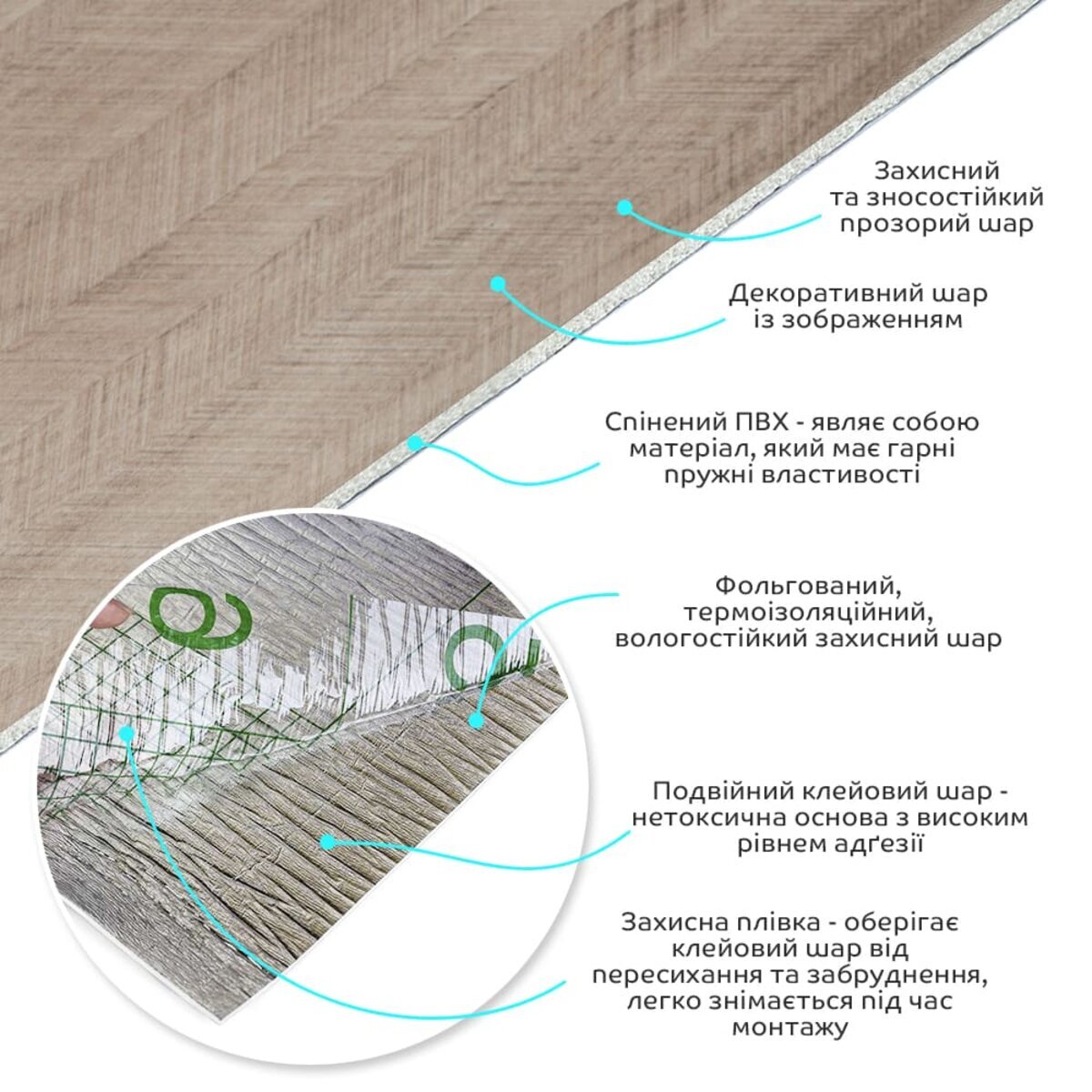 Полімерний шар, що захищає від потертостей та дрібних механічних пошкоджень, забезпечує довговічність використання, а УФ захист допомагає запобігти вигоранню, зберігаючи колір насиченим, за рахунок чого плитка довго має свій первісний естетичний вигляд. Декоративний шар: плівка з кольоровим друком високої роздільної здатності, яка повністю імітує фактуру природних матеріалів завдяки чіткому та детальному зображенню. Основний шар із спіненого полівінілхлориду (ПВХ) – це полімер, що складається з довгих ланцюгів молекул вінілхлориду, в яких містяться атоми хлору, це надає матеріалу стійкість до дії хімічних речовин. ПВХ є аморфним полімером, така особливість будови робить його пружним та ударостійким, а завдяки стабілізаторам та пом'якшувачам, матеріал має малу вагу. Фольгований шар: основна властивість цього шару – відображення теплових хвиль, що дозволяє мінімізувати теплові втрати, тим самим покращити теплоізоляцію приміщення. Клейовий шар: нетоксична основа з високим рівнем адгезії. Захисна плівка – оберігає клейовий шар від пересихання та забруднення, легко знімається під час монтажу. Температурний режим: під впливом високих температур може змінювати форму. У кухонній зоні поруч із джерелами вогню встановлення плитки необхідно проводити на відстані 30-50 см.
