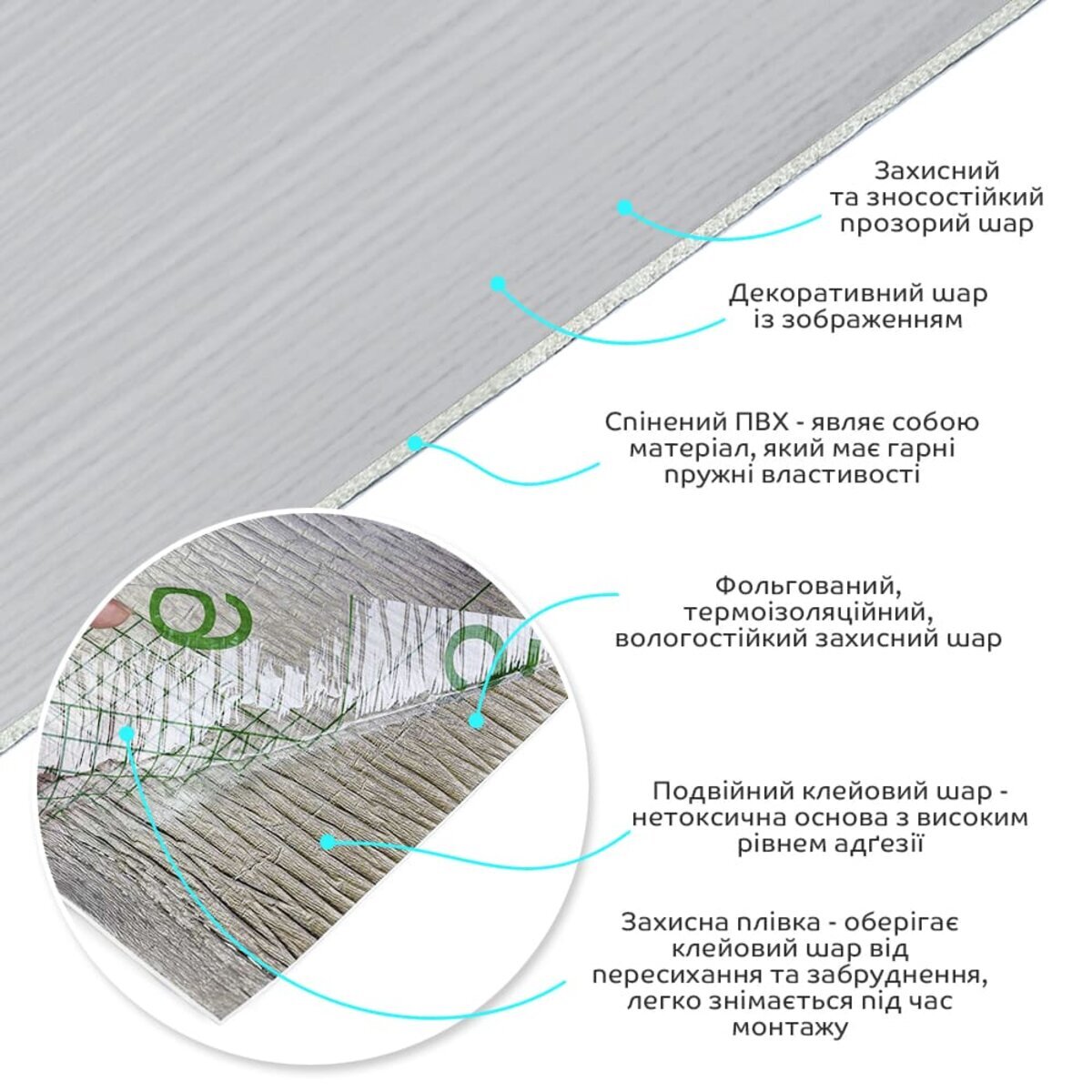 Полімерний шар, що захищає від потертостей та дрібних механічних пошкоджень, забезпечує довговічність використання, а УФ захист допомагає запобігти вигоранню, зберігаючи колір насиченим, за рахунок чого плитка довго має свій первісний естетичний вигляд. Декоративний шар: плівка з кольоровим друком високої роздільної здатності, яка повністю імітує фактуру природних матеріалів завдяки чіткому та детальному зображенню. Основний шар із спіненого полівінілхлориду (ПВХ) – це полімер, що складається з довгих ланцюгів молекул вінілхлориду, в яких містяться атоми хлору, це надає матеріалу стійкість до дії хімічних речовин. ПВХ є аморфним полімером, така особливість будови робить його пружним та ударостійким, а завдяки стабілізаторам та пом'якшувачам, матеріал має малу вагу. Фольгований шар: основна властивість цього шару – відображення теплових хвиль, що дозволяє мінімізувати теплові втрати, тим самим покращити теплоізоляцію приміщення. Клейовий шар: нетоксична основа з високим рівнем адгезії. Захисна плівка – оберігає клейовий шар від пересихання та забруднення, легко знімається під час монтажу. Температурний режим: під впливом високих температур може змінювати форму. У кухонній зоні поруч із джерелами вогню встановлення плитки необхідно проводити на відстані 30-50 см.