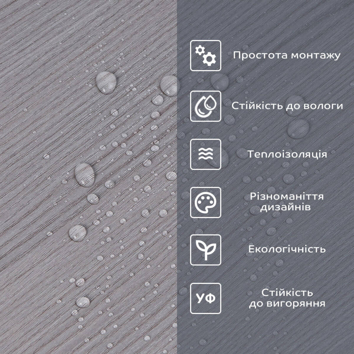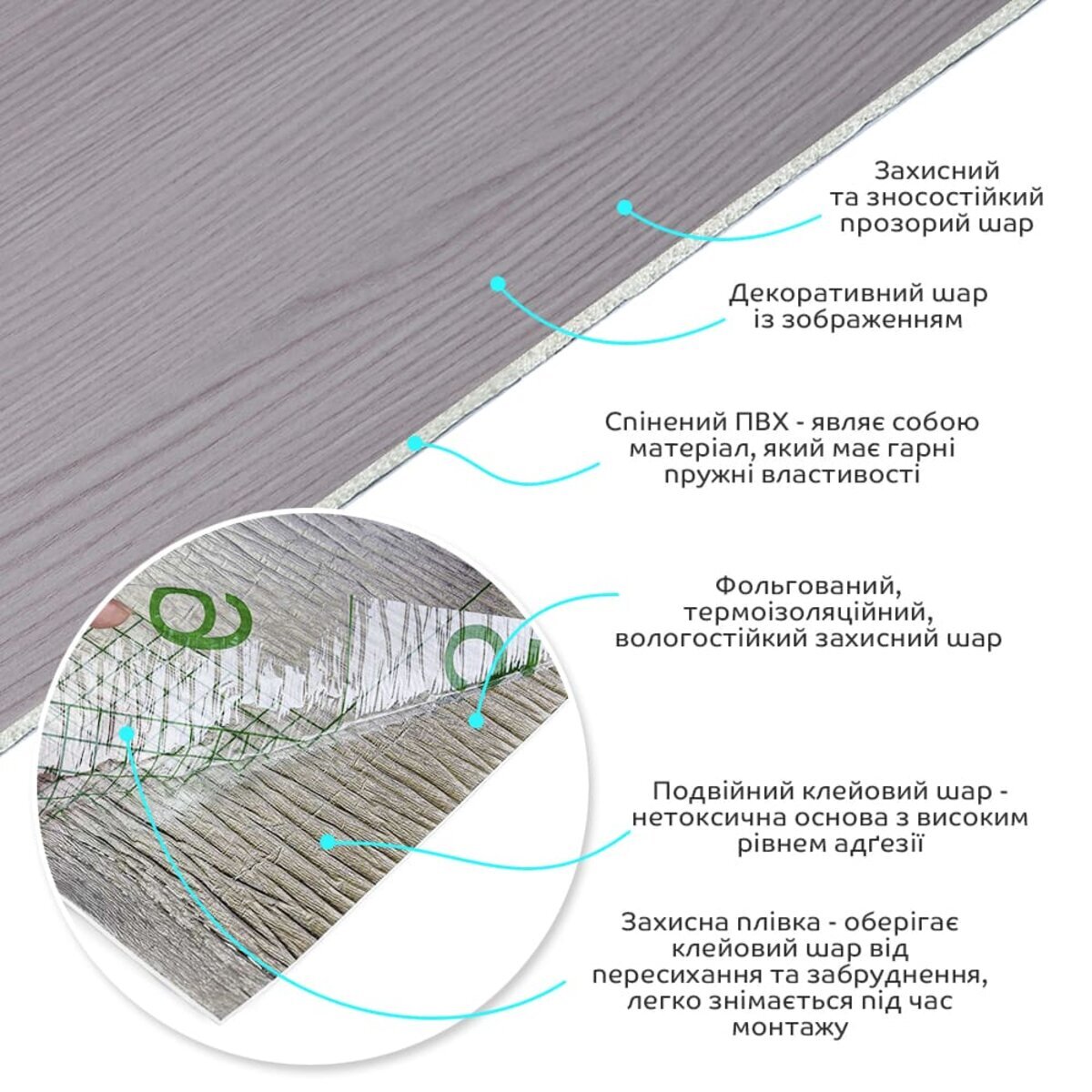 Полімерний шар, що захищає від потертостей та дрібних механічних пошкоджень, забезпечує довговічність використання, а УФ захист допомагає запобігти вигоранню, зберігаючи колір насиченим, за рахунок чого плитка довго має свій первісний естетичний вигляд. Декоративний шар: плівка з кольоровим друком високої роздільної здатності, яка повністю імітує фактуру природних матеріалів завдяки чіткому та детальному зображенню. Основний шар із спіненого полівінілхлориду (ПВХ) – це полімер, що складається з довгих ланцюгів молекул вінілхлориду, в яких містяться атоми хлору, це надає матеріалу стійкість до дії хімічних речовин. ПВХ є аморфним полімером, така особливість будови робить його пружним та ударостійким, а завдяки стабілізаторам та пом'якшувачам, матеріал має малу вагу. Фольгований шар: основна властивість цього шару – відображення теплових хвиль, що дозволяє мінімізувати теплові втрати, тим самим покращити теплоізоляцію приміщення. Клейовий шар: нетоксична основа з високим рівнем адгезії. Захисна плівка – оберігає клейовий шар від пересихання та забруднення, легко знімається під час монтажу. Температурний режим: під впливом високих температур може змінювати форму. У кухонній зоні поруч із джерелами вогню встановлення плитки необхідно проводити на відстані 30-50 см.