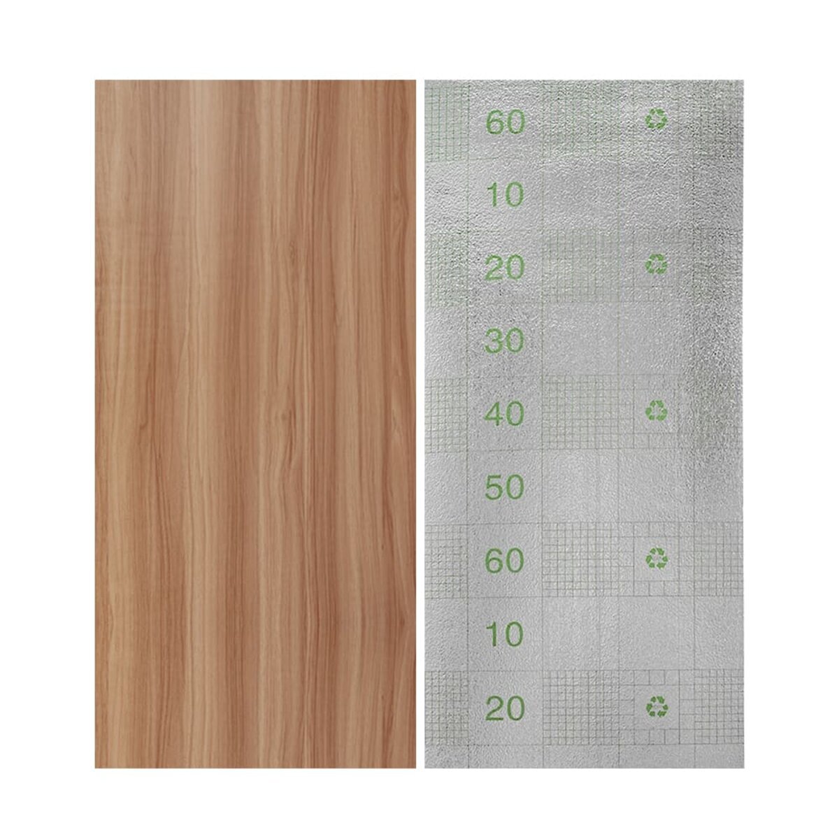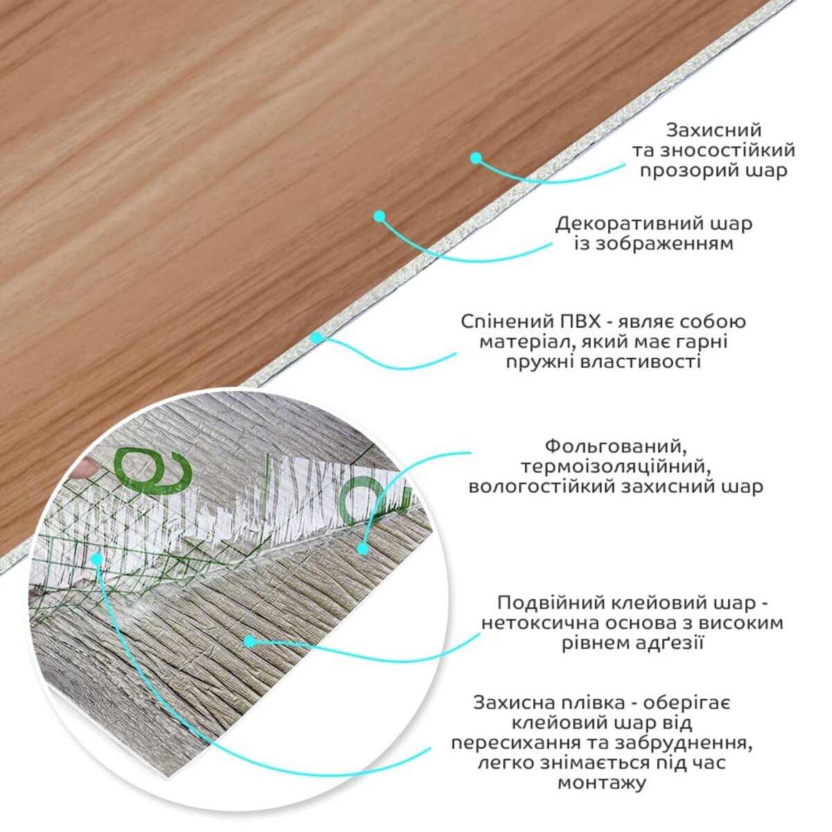 Полімерний шар, що захищає від потертостей та дрібних механічних пошкоджень, забезпечує довговічність використання, а УФ захист допомагає запобігти вигоранню, зберігаючи колір насиченим, за рахунок чого плитка довго має свій первісний естетичний вигляд. Декоративний шар: плівка з кольоровим друком високої роздільної здатності, яка повністю імітує фактуру природних матеріалів завдяки чіткому та детальному зображенню. Основний шар із спіненого полівінілхлориду (ПВХ) – це полімер, що складається з довгих ланцюгів молекул вінілхлориду, в яких містяться атоми хлору, це надає матеріалу стійкість до дії хімічних речовин. ПВХ є аморфним полімером, така особливість будови робить його пружним та ударостійким, а завдяки стабілізаторам та пом'якшувачам, матеріал має малу вагу. Фольгований шар: основна властивість цього шару – відображення теплових хвиль, що дозволяє мінімізувати теплові втрати, тим самим покращити теплоізоляцію приміщення. Клейовий шар: нетоксична основа з високим рівнем адгезії. Захисна плівка – оберігає клейовий шар від пересихання та забруднення, легко знімається під час монтажу. Температурний режим: під впливом високих температур може змінювати форму. У кухонній зоні поруч із джерелами вогню встановлення плитки необхідно проводити на відстані 30-50 см.