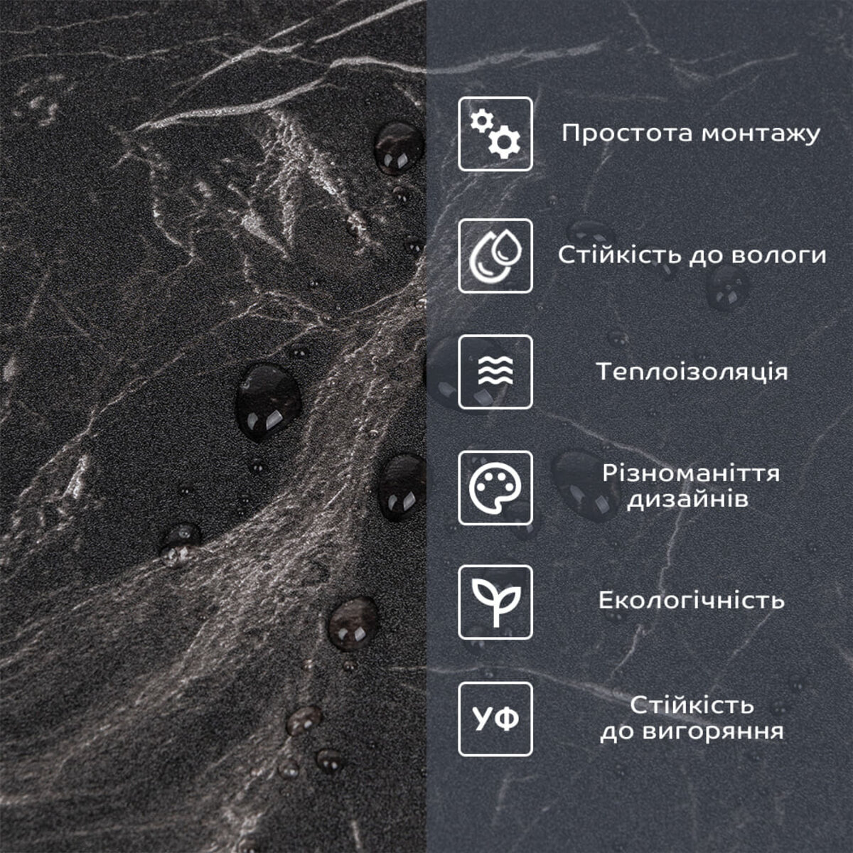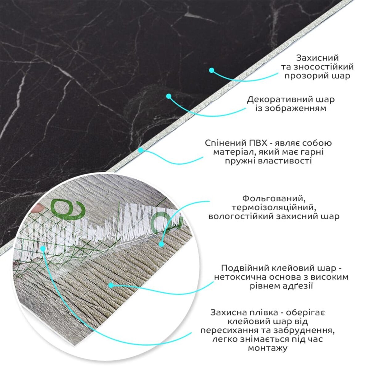 Полімерний шар, що захищає від потертостей та дрібних механічних пошкоджень, забезпечує довговічність використання, а УФ захист допомагає запобігти вигоранню, зберігаючи колір насиченим, за рахунок чого плитка довго має свій первісний естетичний вигляд. Декоративний шар: плівка з кольоровим друком високої роздільної здатності, яка повністю імітує фактуру природних матеріалів завдяки чіткому та детальному зображенню. Основний шар із спіненого полівінілхлориду (ПВХ) – це полімер, що складається з довгих ланцюгів молекул вінілхлориду, в яких містяться атоми хлору, це надає матеріалу стійкість до дії хімічних речовин. ПВХ є аморфним полімером, така особливість будови робить його пружним та ударостійким, а завдяки стабілізаторам та пом'якшувачам, матеріал має малу вагу. Фольгований шар: основна властивість цього шару – відображення теплових хвиль, що дозволяє мінімізувати теплові втрати, тим самим покращити теплоізоляцію приміщення. Клейовий шар: нетоксична основа з високим рівнем адгезії. Захисна плівка – оберігає клейовий шар від пересихання та забруднення, легко знімається під час монтажу. Температурний режим: під впливом високих температур може змінювати форму. У кухонній зоні поруч із джерелами вогню встановлення плитки необхідно проводити на відстані 30-50 см.