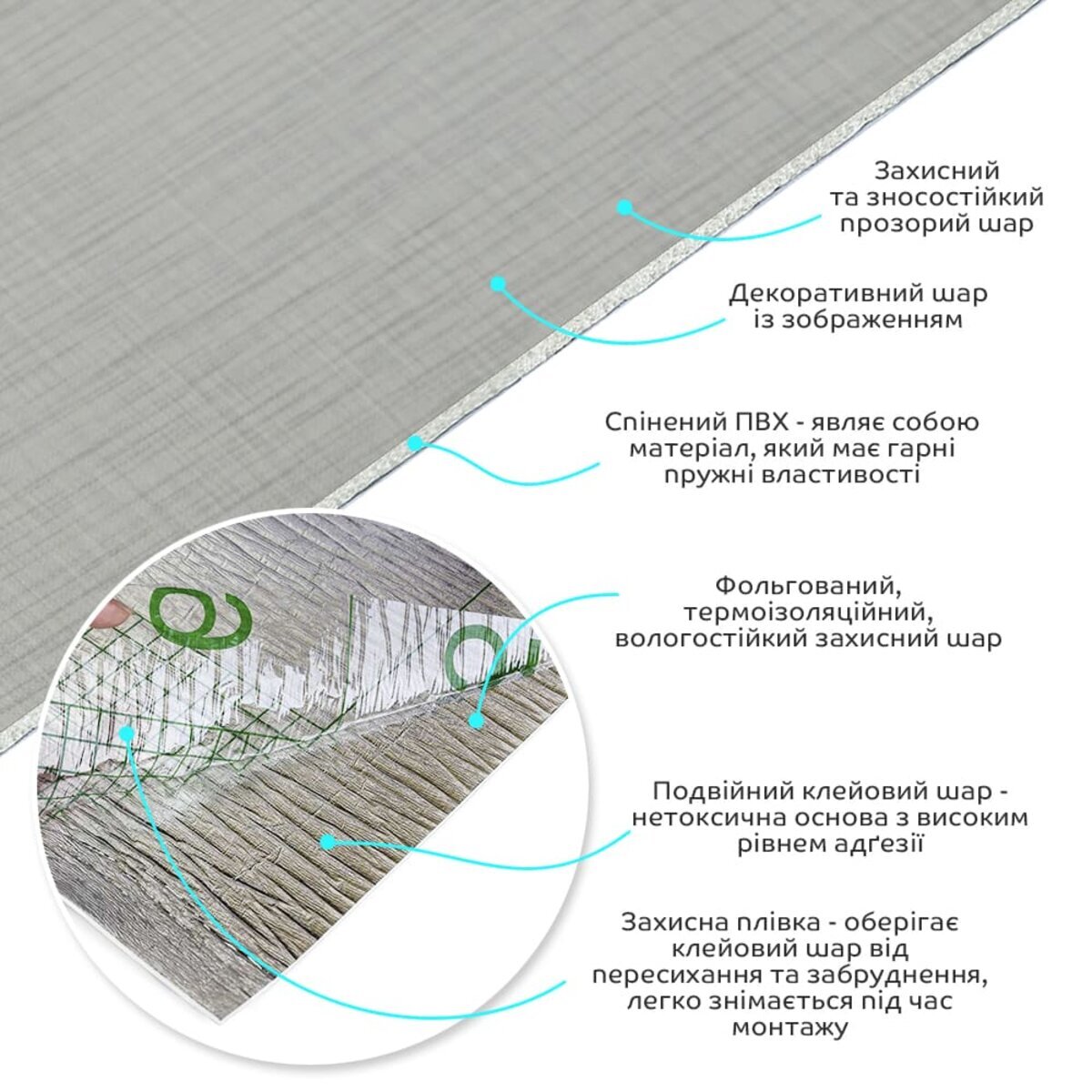 Полімерний шар, що захищає від потертостей та дрібних механічних пошкоджень, забезпечує довговічність використання, а УФ захист допомагає запобігти вигоранню, зберігаючи колір насиченим, за рахунок чого плитка довго має свій первісний естетичний вигляд. Декоративний шар: плівка з кольоровим друком високої роздільної здатності, яка повністю імітує фактуру природних матеріалів завдяки чіткому та детальному зображенню. Основний шар із спіненого полівінілхлориду (ПВХ) – це полімер, що складається з довгих ланцюгів молекул вінілхлориду, в яких містяться атоми хлору, це надає матеріалу стійкість до дії хімічних речовин. ПВХ є аморфним полімером, така особливість будови робить його пружним та ударостійким, а завдяки стабілізаторам та пом'якшувачам, матеріал має малу вагу. Фольгований шар: основна властивість цього шару – відображення теплових хвиль, що дозволяє мінімізувати теплові втрати, тим самим покращити теплоізоляцію приміщення. Клейовий шар: нетоксична основа з високим рівнем адгезії. Захисна плівка – оберігає клейовий шар від пересихання та забруднення, легко знімається під час монтажу. Температурний режим: під впливом високих температур може змінювати форму. У кухонній зоні поруч із джерелами вогню встановлення плитки необхідно проводити на відстані 30-50 см.