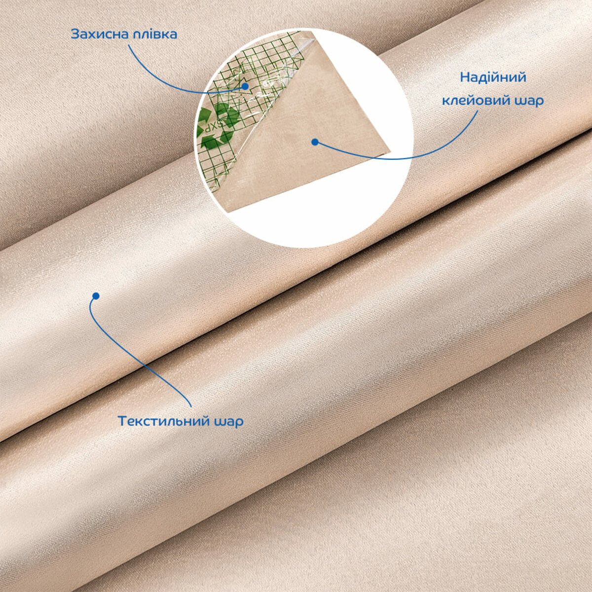 Матеріал являє собою декоративне покриття з верхнім текстильним шаром, який має легкий блиск і делікатний перелив, що візуально нагадує сатин. При цьому він поєднує естетику тканини з практичністю самоклеючої основи. Завдяки надійному клейовому шару матеріал міцно фіксується на поверхні без використання додаткових інструментів чи витратних матеріалів, формуючи рівне та акуратне покриття.