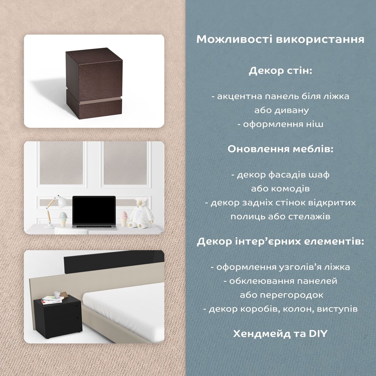 Матеріал являє собою декоративне покриття з верхнім текстильним шаром, який має легкий блиск і делікатний перелив, що візуально нагадує сатин. При цьому він поєднує естетику тканини з практичністю самоклеючої основи. Завдяки надійному клейовому шару матеріал міцно фіксується на поверхні без використання додаткових інструментів чи витратних матеріалів, формуючи рівне та акуратне покриття.