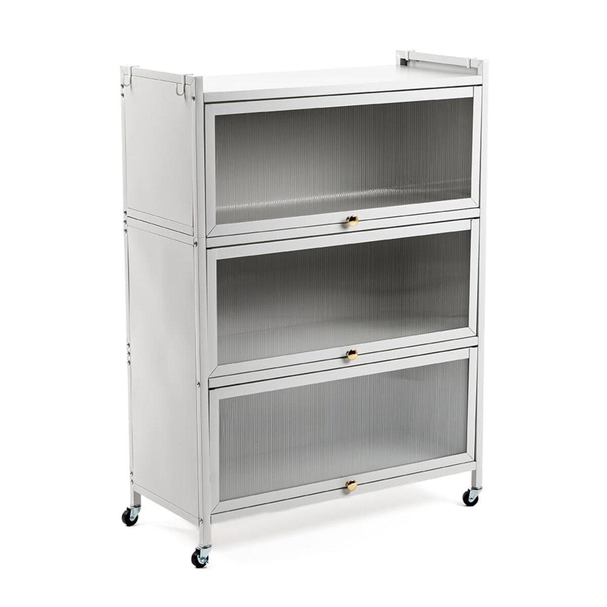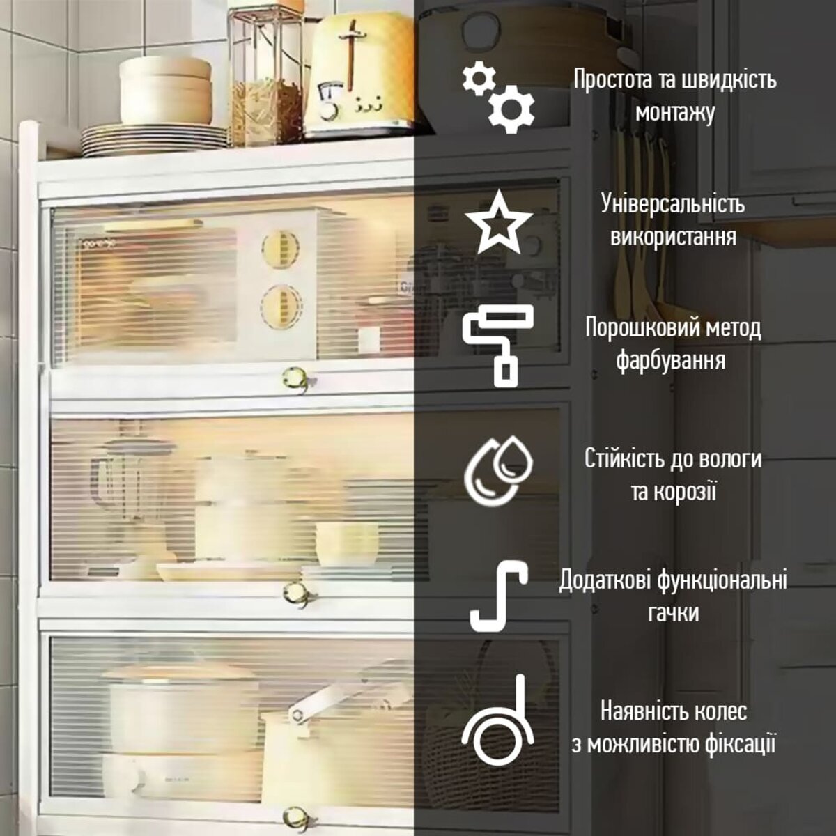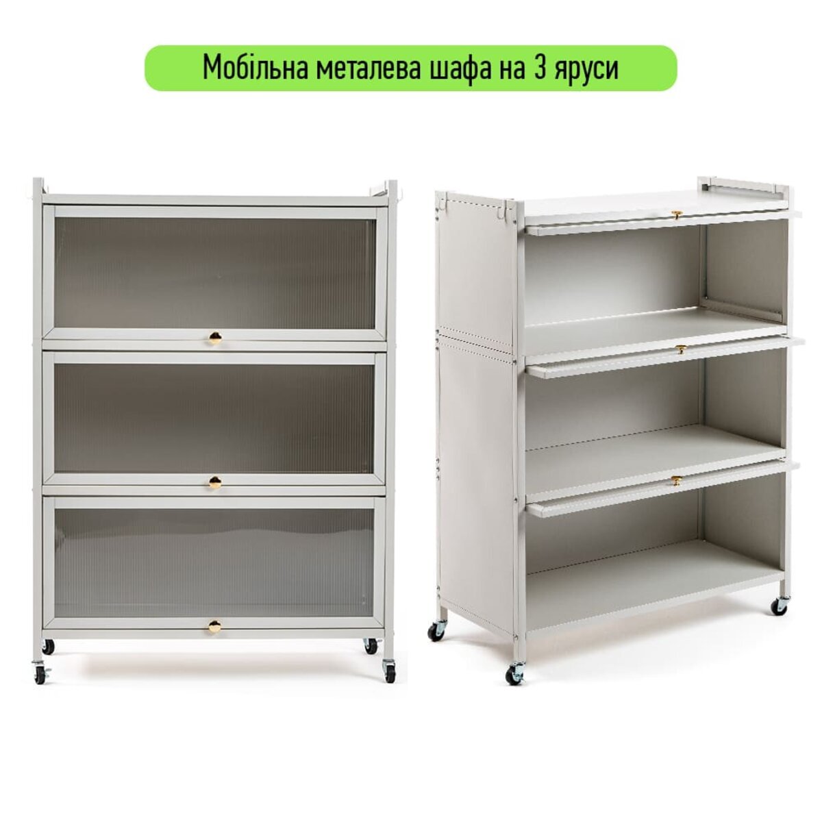 Представляємо вашій увазі триярусну збірну металеву шафу на колесах — ідеальне рішення для зберігання в будь-яких умовах! Завдяки зручним ручкам з магнітним прокладкам дверцята шафи надійно закриваються, а при необхідності фіксуються у відкритому положенні і можуть бути заховані під верхню полицю. Стильний світло-сірий колір та порошкове фарбування забезпечують не лише міцність та довговічність, а й сучасний естетичний вигляд. Ця шафа стане незамінним помічником як у житлових, так і в комерційних приміщеннях, забезпечуючи порядок та зручний доступ до ваших речей.