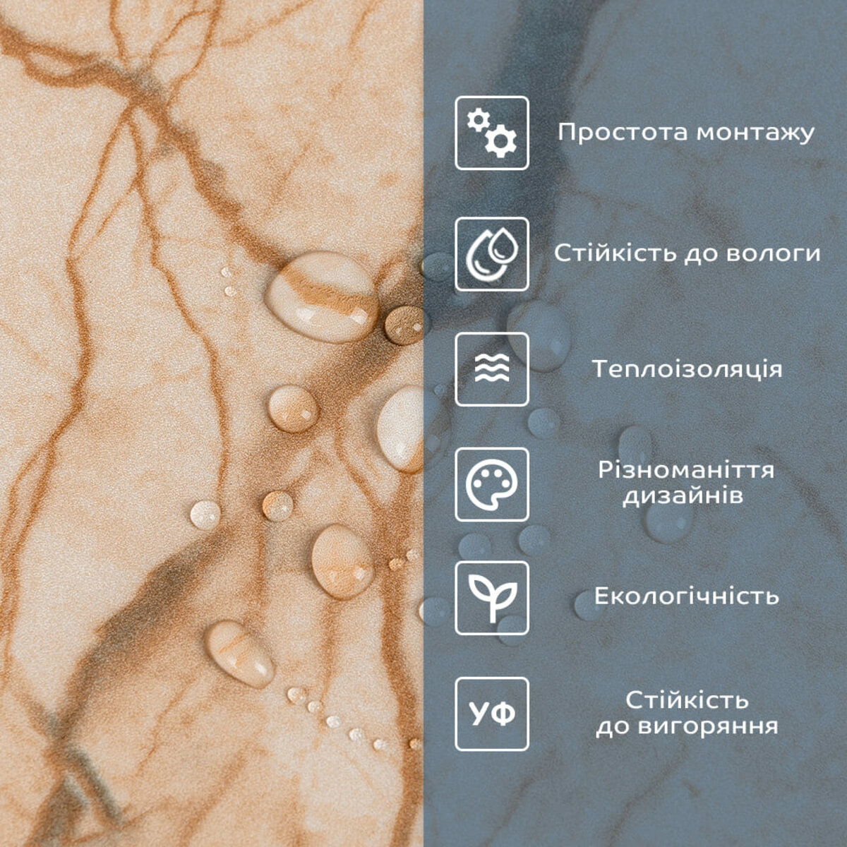 - Декоративний шар: плівка з кольоровим друком високої якості, яка повністю імітує фактуру природних матеріалів завдяки чіткому та деталізованому зображенню.