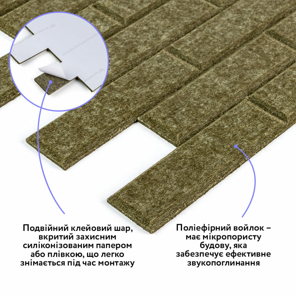 Самоклеючі звукоїзоляційні панелі –це багатошаровий оздоблювально-функціональний матеріал, призначений для зниження рівня шуму та покращення акустики приміщення. Основу панелей становить пресований поліефірний войлок, який забезпечує ефективну звуко- й додаткову теплоізоляцію, поєднуючи легку вагу з високою стійкістю до деформацій. Завдяки клейовому шару панелі швидко монтуються, а однотонна поверхня з виразним 3D-ефектом (під рейку або цеглу) поєднує технічні властивості з сучасним декоративним виглядом.