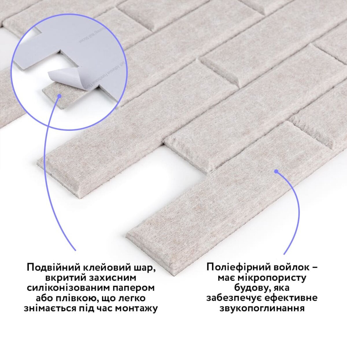 Самоклеючі звукоїзоляційні панелі –це багатошаровий оздоблювально-функціональний матеріал, призначений для зниження рівня шуму та покращення акустики приміщення. Основу панелей становить пресований поліефірний войлок, який забезпечує ефективну звуко- й додаткову теплоізоляцію, поєднуючи легку вагу з високою стійкістю до деформацій. Завдяки клейовому шару панелі швидко монтуються, а однотонна поверхня з виразним 3D-ефектом (під рейку або цеглу) поєднує технічні властивості з сучасним декоративним виглядом.